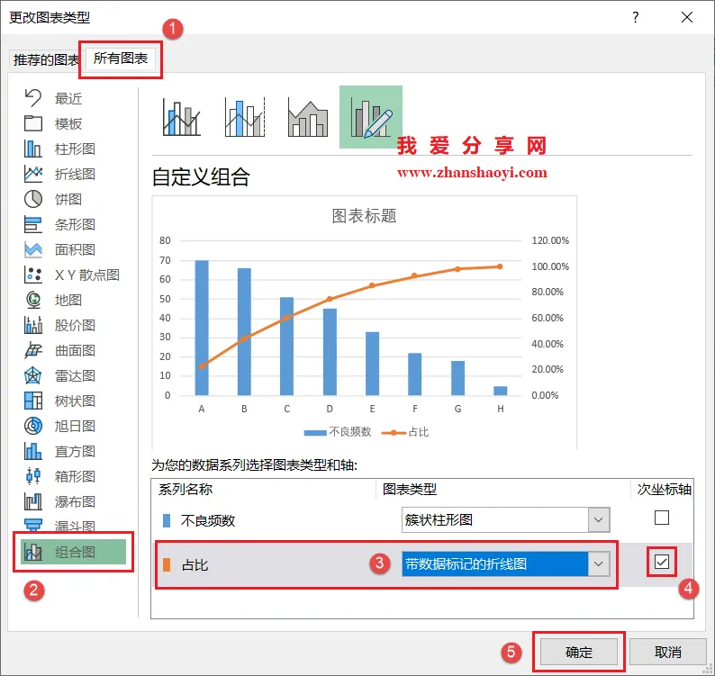 6、打开如下对话框,修改图表类型如下,占比系列图表类型设置为带数据标记的折线图,并将其放置在次坐标轴,点击【确定】退出;