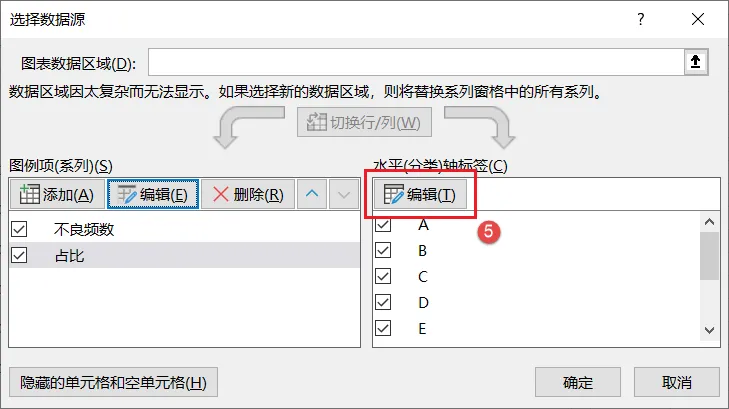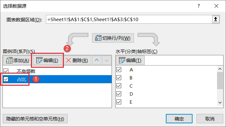 17、打开如下对话框,先点击左侧「占比」(即累积占比对应的数据系列),然后点击【编辑】按钮;再在系列值引用区域中,框选C2:C10(即累积占比的数据范围),然后点击【确定】;继续右侧水平轴标签栏下的【编辑】按钮,在「轴标签区域」引用区域中,框选A2:A10,然后点击【确定】;点击【确定】退出;