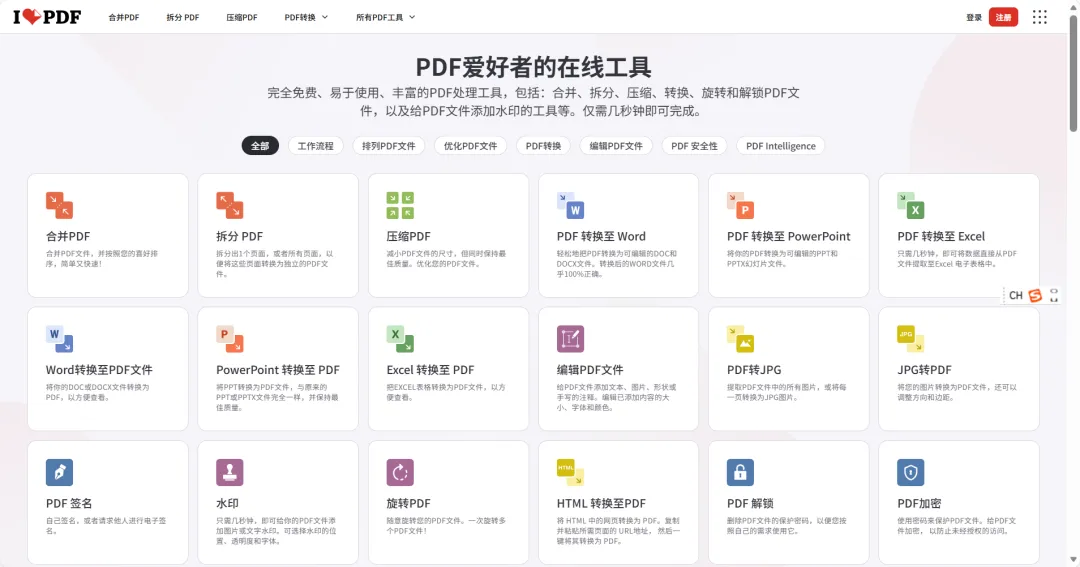 I ❤ PDF 是一个功能强大、完全免费的在线PDF处理工具套件。它几乎涵盖了所有PDF的常见操作需求,因其简单、高效、无广告、无水印的特性,被誉为在线PDF处理的“瑞士军刀”。功能全面且免费:提供20+种核心功能,从合并拆分到转换编辑,完全免费,没有使用次数或文件大小限制(有单文件大小上限,但足够使用)。