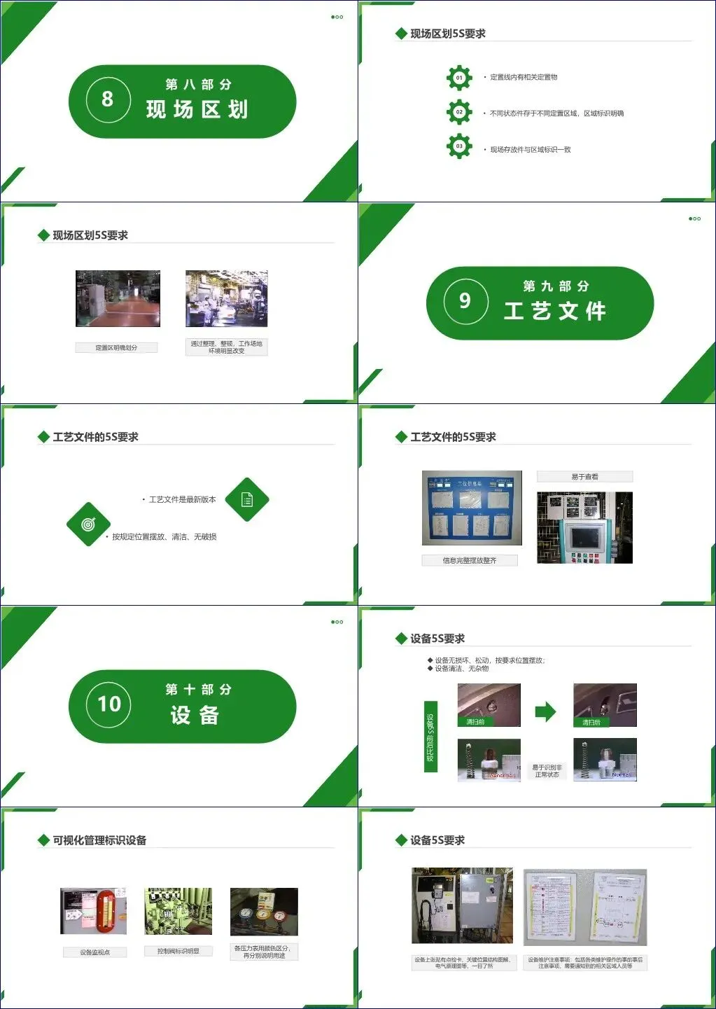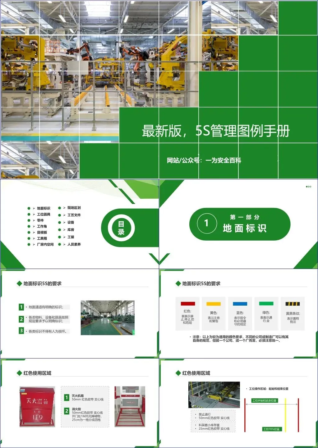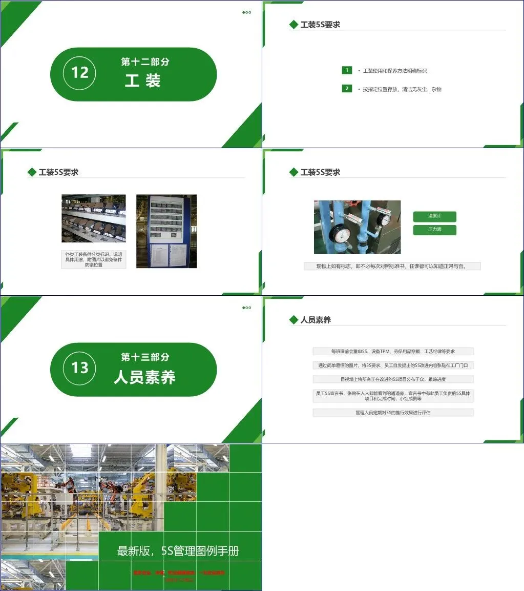 该文档《5S管理图例手册》系统性地介绍了制造业现场推行5S(整理、整顿、清扫、清洁、素养)管理的具体实施标准与可视化规范,覆盖了从地面标识到人员素养的十三个关键模块。内容强调通过可视化管理、定置定位、标准化操作等手段提升现场效率、安全性和员工行为规范。