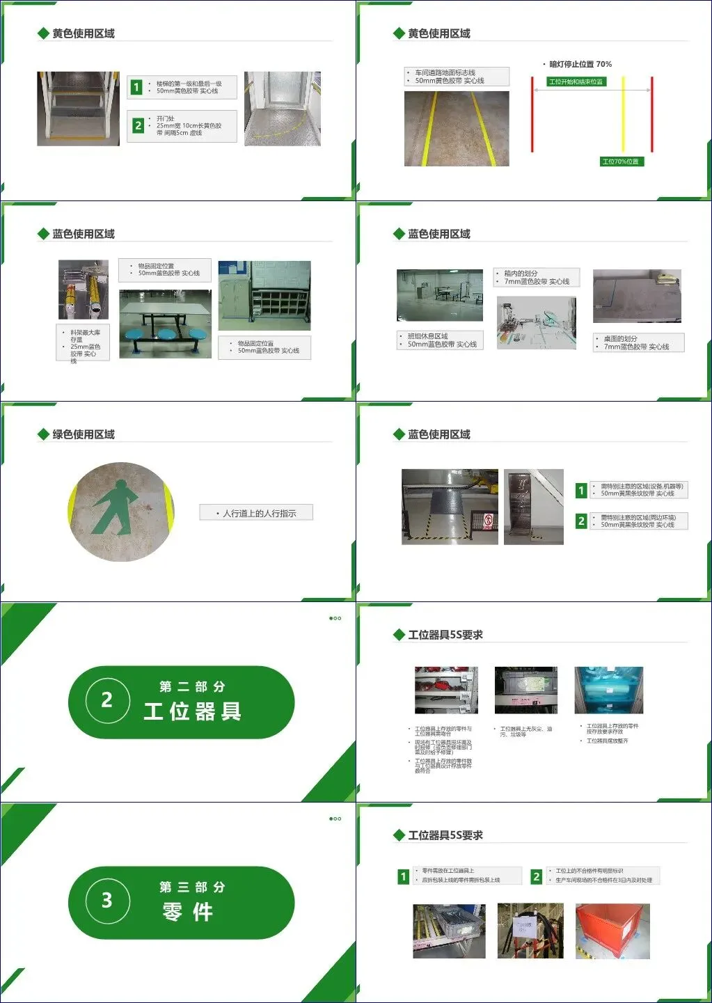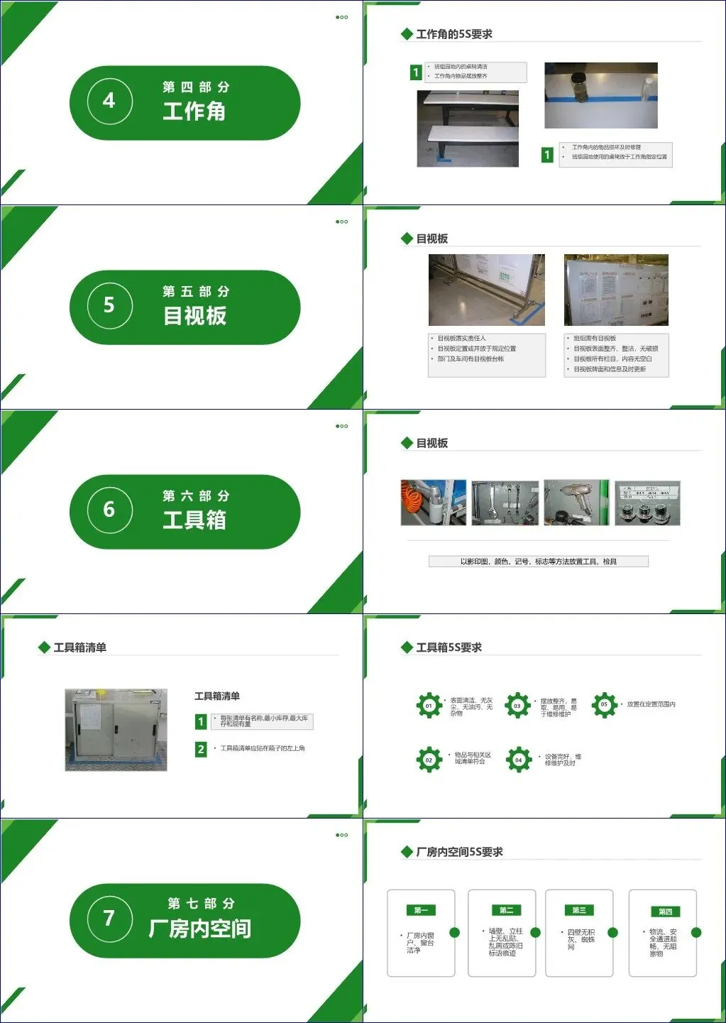 其次,工位器具和零件管理要求器具清洁、摆放整齐、数量合规,并确保不合格品有明显标识且3日内处理。工作角需保持整洁,桌椅定点放置;目视板须责任到人、内容完整、及时更新;工具箱采用影印图或色标实现工具“一目了然”,清单张贴于左上角并标明库存上下限。