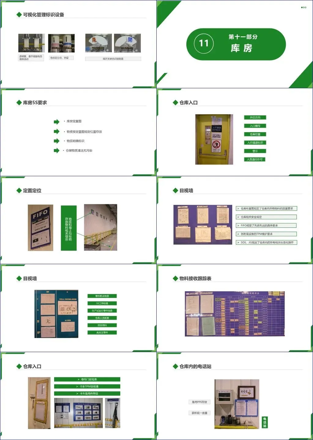 库房管理部分突出定置图、FIFO(先进先出)、目视墙(如断点信息、高关注零件)及附属设施(如PPE存放、茶杯统一放置)的标准化;工装则要求标识使用保养方法、分类存放、附图防错。