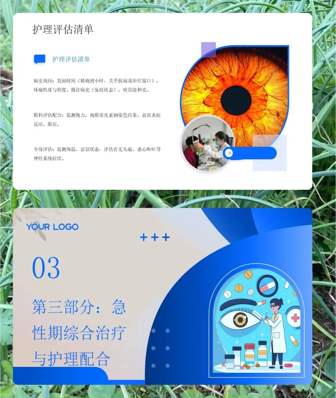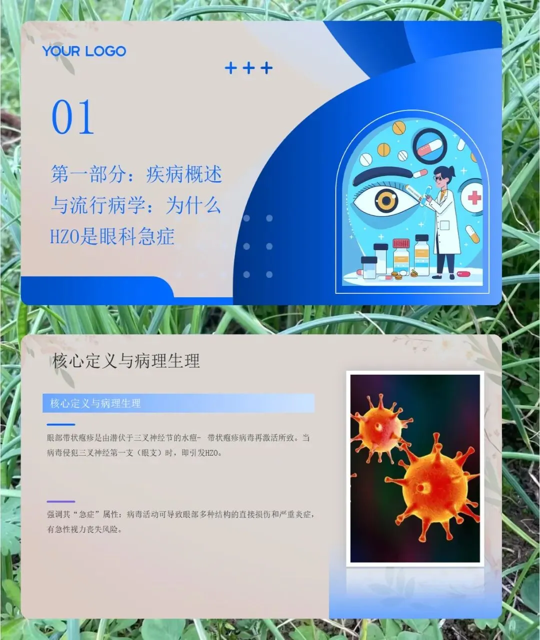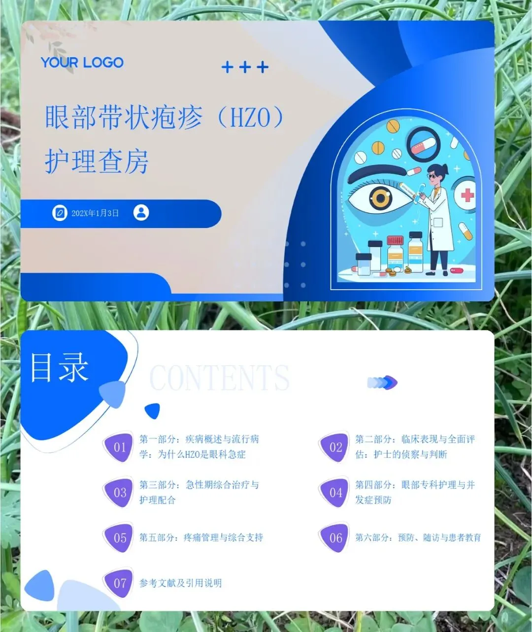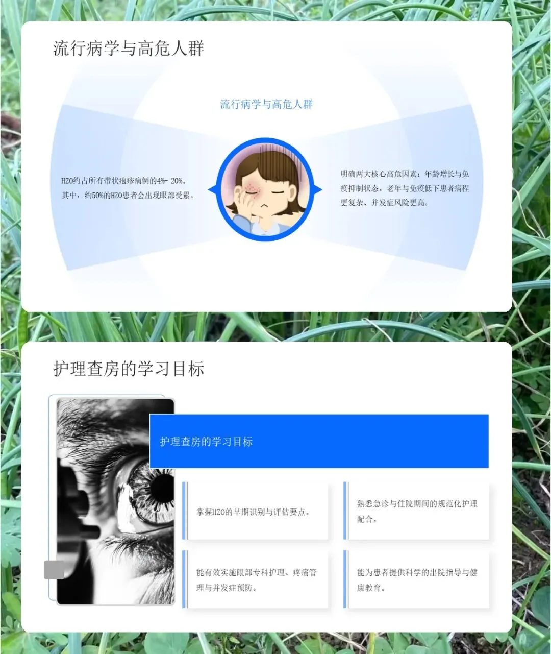 首先说疾病本身,HZO 是水痘 - 带状疱疹病毒潜伏在三叉神经节,再激活后侵犯三叉神经第一支引发的。它占所有带状疱疹的 4%-20%,一半患者会眼部受累,年龄大、免疫抑制的人患病后情况更复杂,并发症风险高,病毒会直接损伤眼部结构,还可能让患者急性视力丧失,所以必须按急症处理。咱们这次查房,核心是掌握 HZO 的早期识别评估,做好专科护理、疼痛管理,配合好治疗,还要能给患者做出院指导。