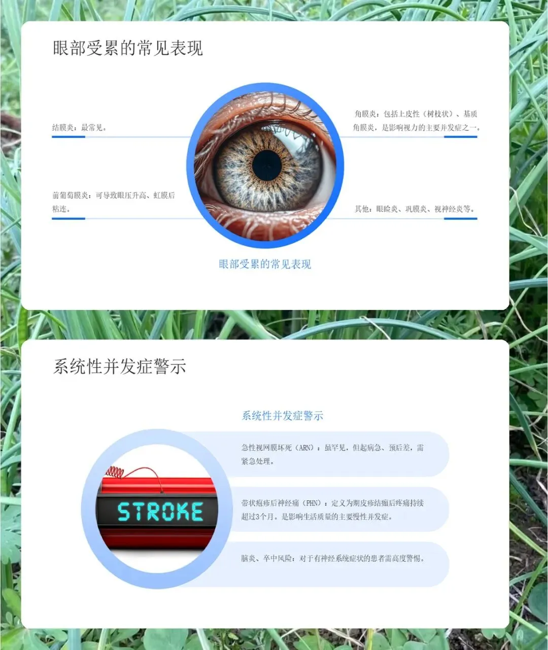 接下来讲临床表现和评估。患者发病前,单侧额头、眼周会有剧痛、烧灼感,这些症状会比皮疹先出现。之后会在三叉神经眼支支配的前额、上眼睑、鼻尖出现成簇水疱,不会越过中线,鼻尖有疱疹的话,大概率角膜受累了。眼部受累常见结膜炎、角膜炎,还有前葡萄膜炎,严重的会出现急性视网膜坏死,全身方面可能引发带状疱疹后神经痛,也就是皮疹结痂后疼痛超 3 个月,还有脑炎、卒中的风险,这些都要警惕。评估的时候,要问清楚发病时间,精确到小时,还有疼痛情况、既往病史、疫苗接种史,同时配合监测视力、眼压,观察体温、意识状态,看有没有头痛、呕吐等神经症状。