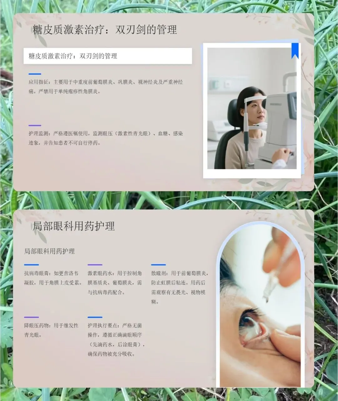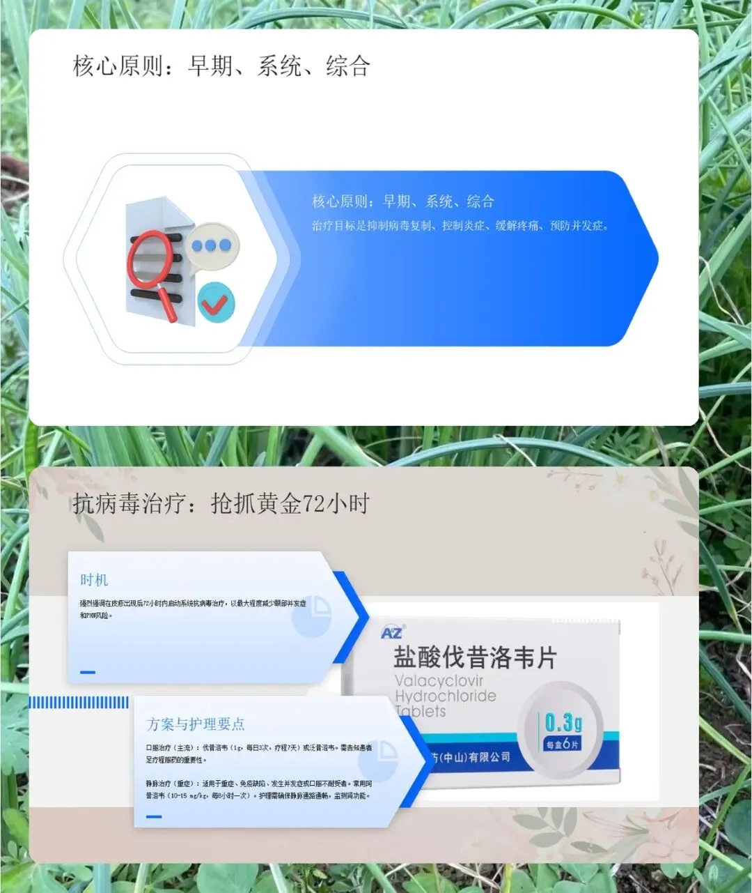 然后是急性期的治疗和护理配合,核心就是早期、系统、综合,目标是抑制病毒、控制炎症、缓解疼痛、防并发症。抗病毒治疗一定要抓住皮疹出现后 72 小时的黄金时间,口服主要用伐昔洛韦,重症的静脉用阿昔洛韦,护理要注意监测肾功能,保证静脉通路通畅。糖皮质激素要严格按指征用,监测眼压、血糖,不能自行停药。局部用药有抗病毒眼膏、降眼压药、激素眼药水等,滴眼要按先药水后眼膏的顺序,无菌操作。