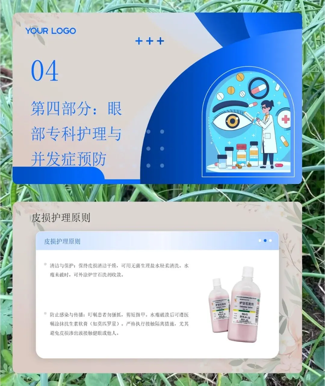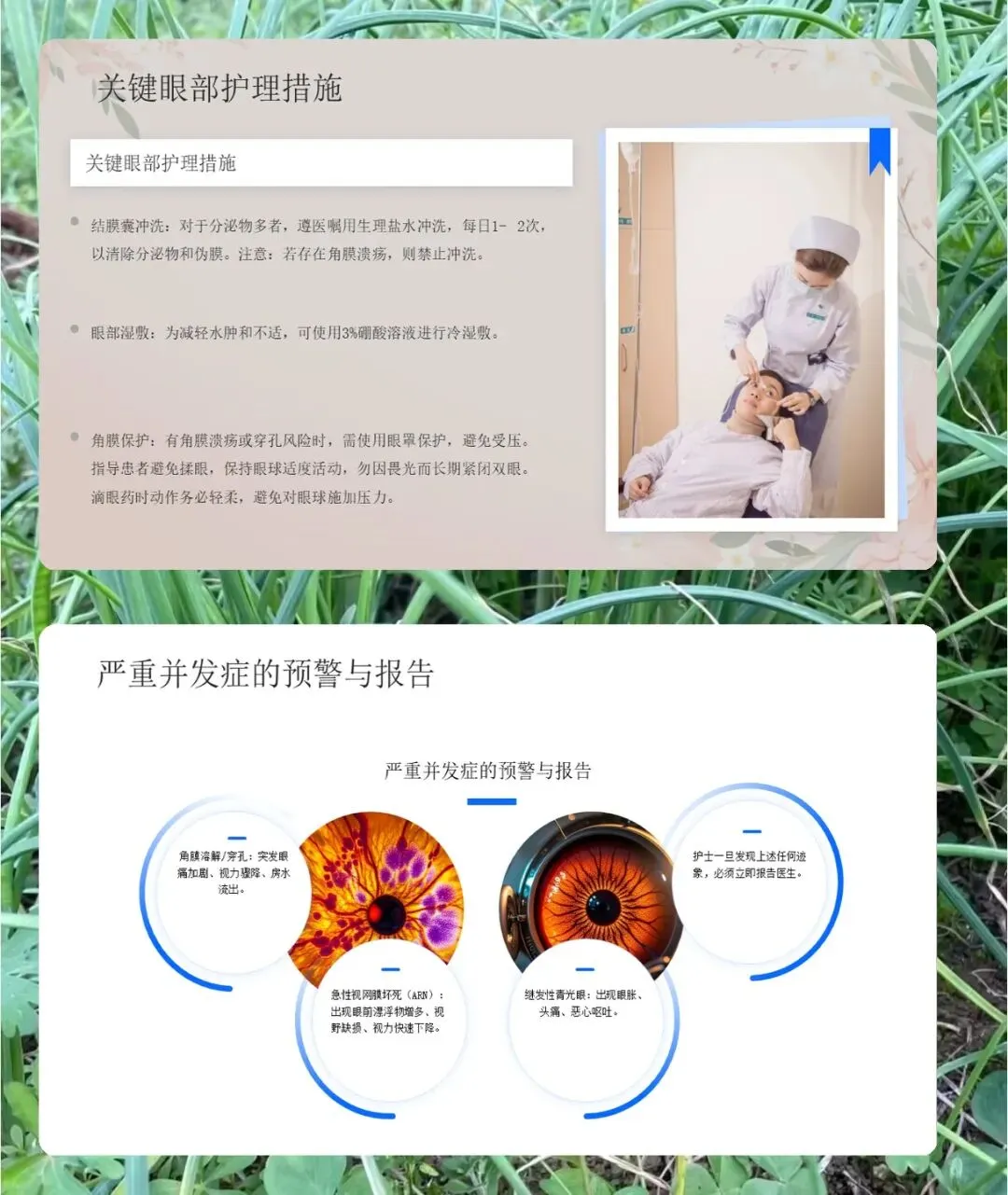 眼部专科护理这块,皮损要保持清洁干燥,水疱没破涂炉甘石洗剂,破了涂抗生素软膏,叮嘱患者别搔抓。分泌物多的话用生理盐水冲洗结膜囊,角膜溃疡的话不能冲,还能用 3% 硼酸溶液冷湿敷减轻水肿。角膜有风险的用眼罩保护,滴眼药动作要轻。发现患者眼痛加剧、视力骤降、眼胀头痛这些情况,要马上报告医生,这可能是角膜穿孔、继发性青光眼的征兆。