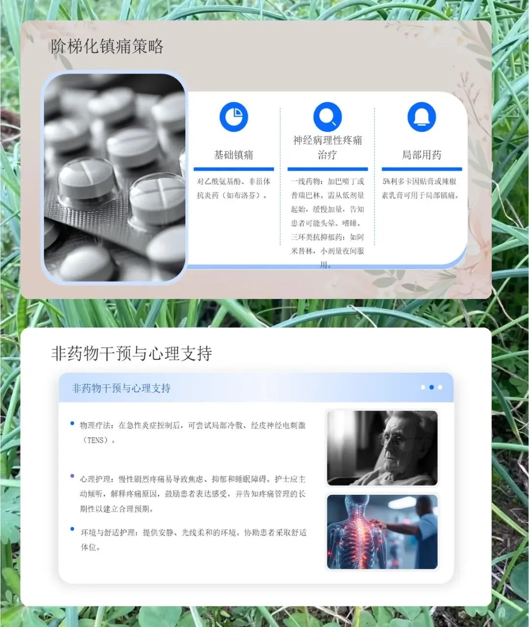 疼痛管理要先用评分量表评估,区分急性神经痛和带状疱疹后神经痛。镇痛分基础镇痛、神经病理性疼痛治疗,还有局部用药,剂量要从低到高调。同时可以用冷敷、电刺激等物理方法,多和患者沟通,做好心理护理,提供安静的环境。