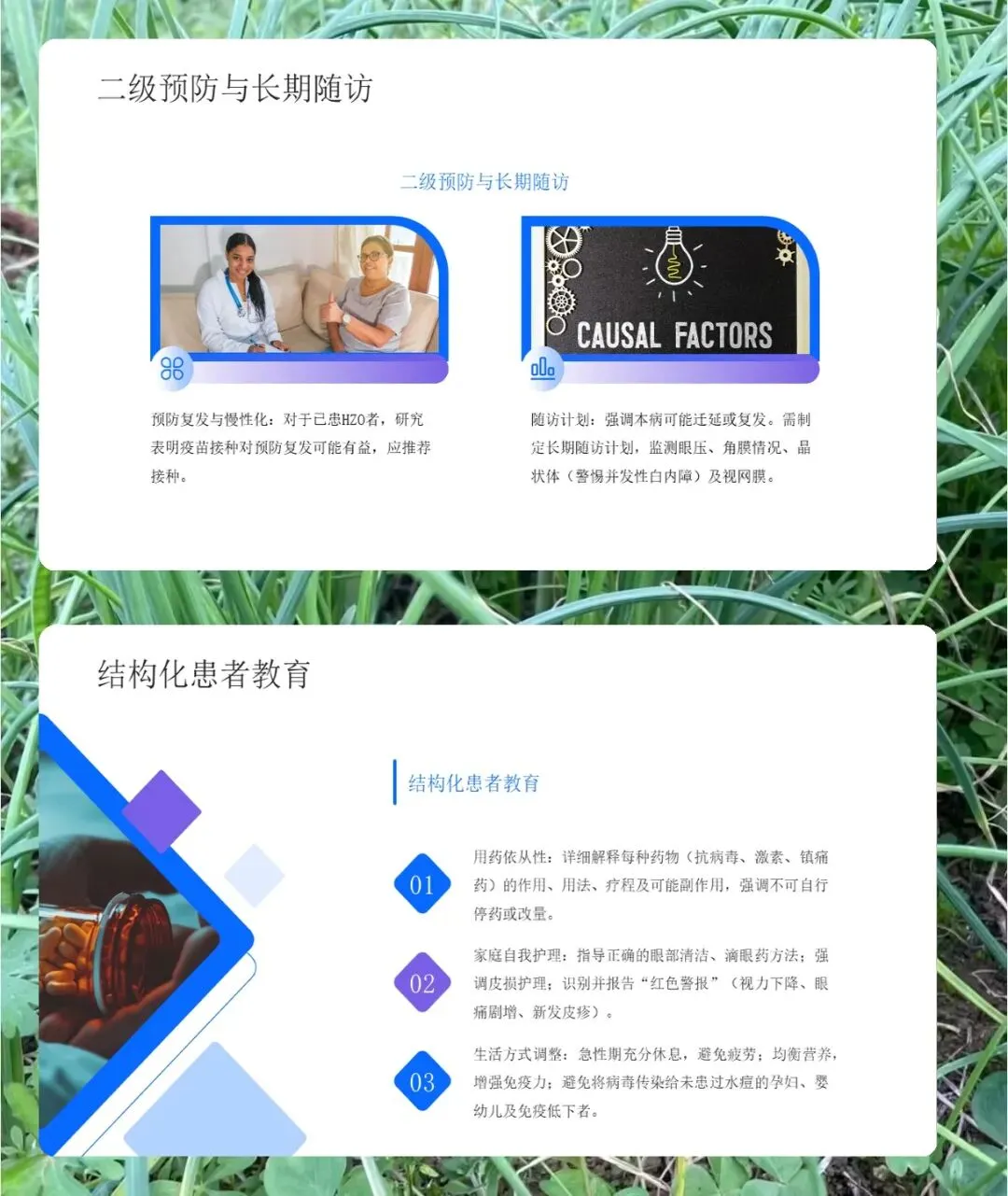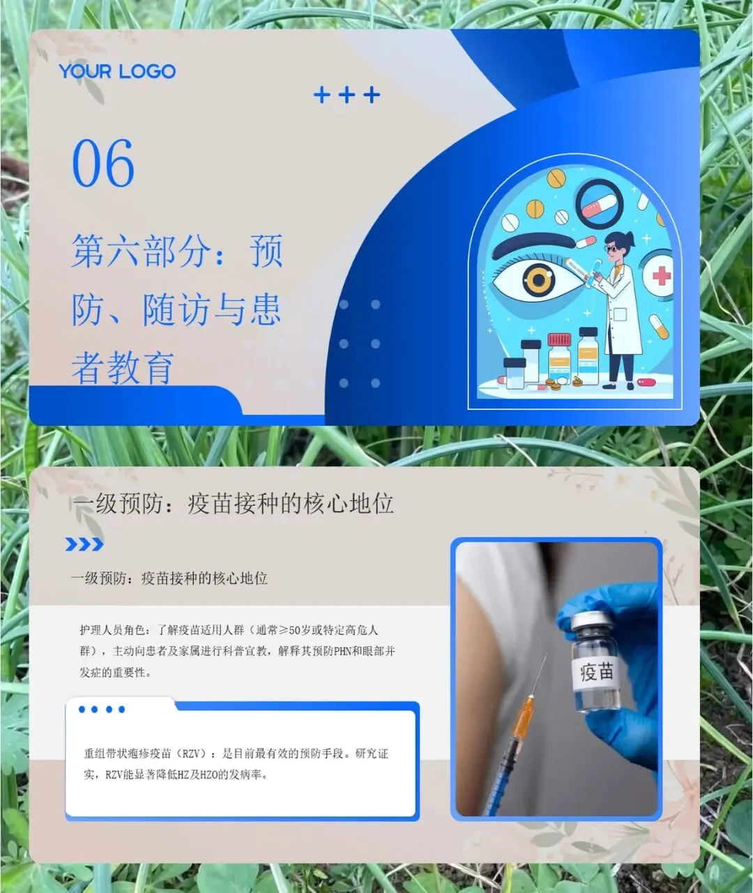 最后是预防和患者教育,重组带状疱疹疫苗是主要预防手段,≥50 岁和高危人群都建议接种,患病后接种也能预防复发。患者出院后要长期随访,监测眼压、角膜等情况。教育患者要按医嘱吃药,不能自己改量停药,教他们正确做眼部和皮损护理,识别不适症状及时就医,急性期多休息、补营养,避免传染给他人。