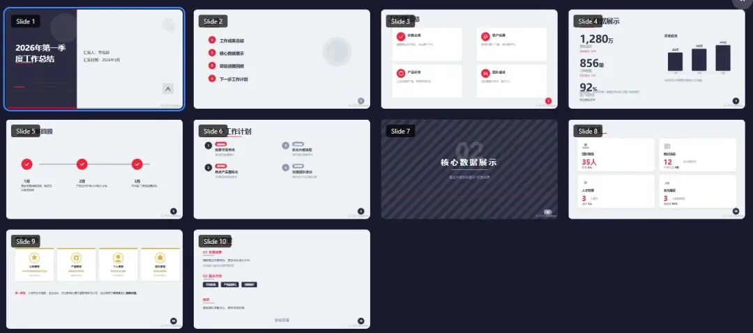 生成一份工作汇报PPT,主题:2026年第一季度工作总结。包含封面页、目录页、工作成果总结、数据展示页、下一步计划,约10页,商务风。