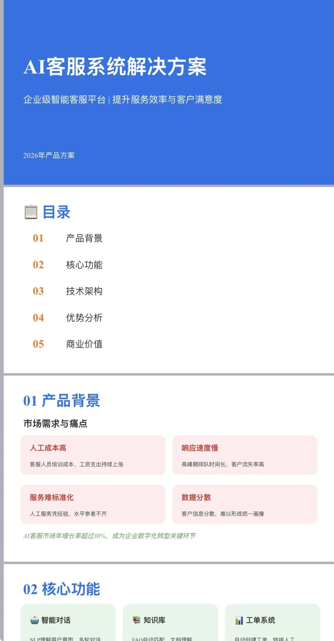 生成产品方案PPT:AI客服系统解决方案,包含产品背景、核心功能、技术架构、优势分析、商业价值。