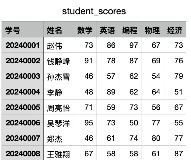 帮我创建一个包含 100 位同学、5 门课(数学、英语、编程、物理、经济)成绩的 Excel 文件(student_scores.csv),数据随机生成但要真实合理。
