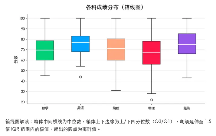 ✅ 读取数据——解析 Excel/CSV 文件✅ 计算统计——平均分、最高分、最低分、排名✅ 生成图表——柱状图、饼图、箱线图✅ 输出报告——整理成 Word/PDF 格式