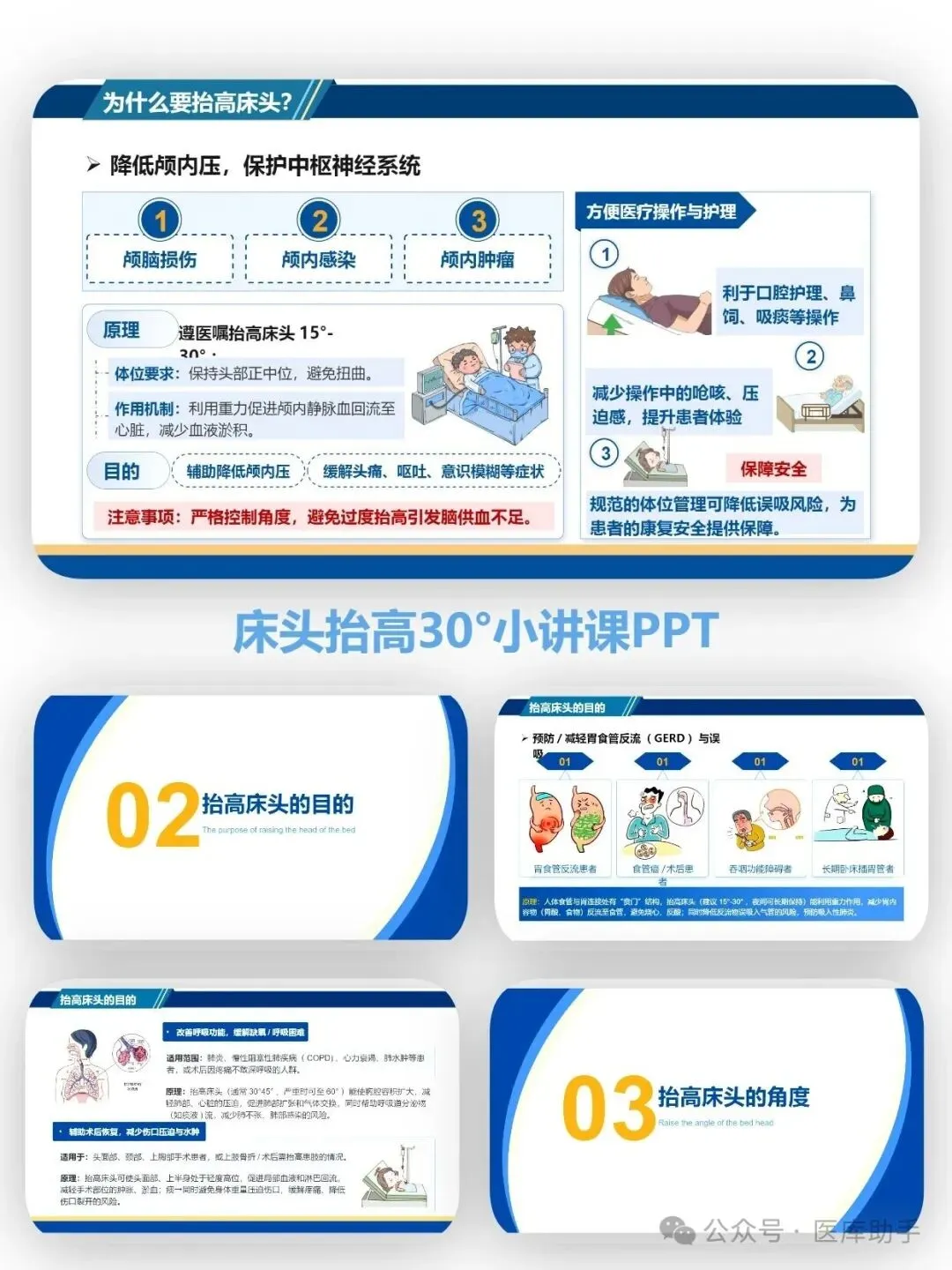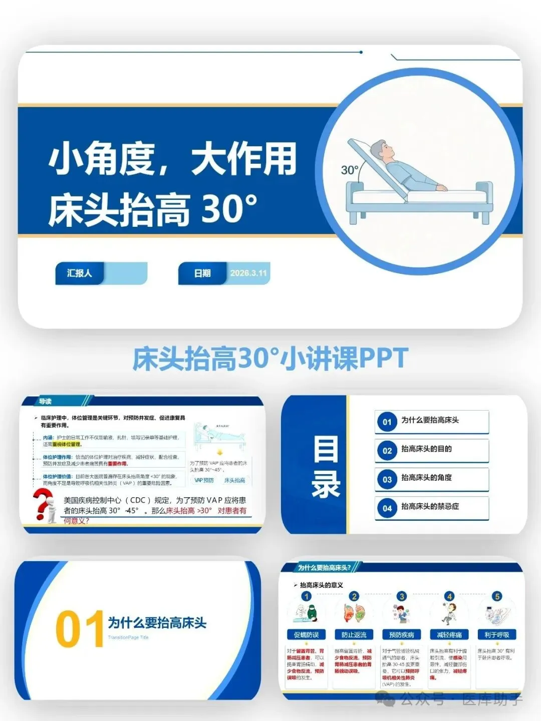 一个看似简单的体位调整,却是重症护理的"隐形守护者"。床头抬高30°,这个不起眼的小角度,背后藏着预防呼吸机相关性肺炎(VAP)、降低颅内压、改善呼吸功能等多重护理智慧。本套小讲课PPT专为临床护士设计,用15-20分钟讲透"为什么抬、怎么抬、抬不好怎么办"。