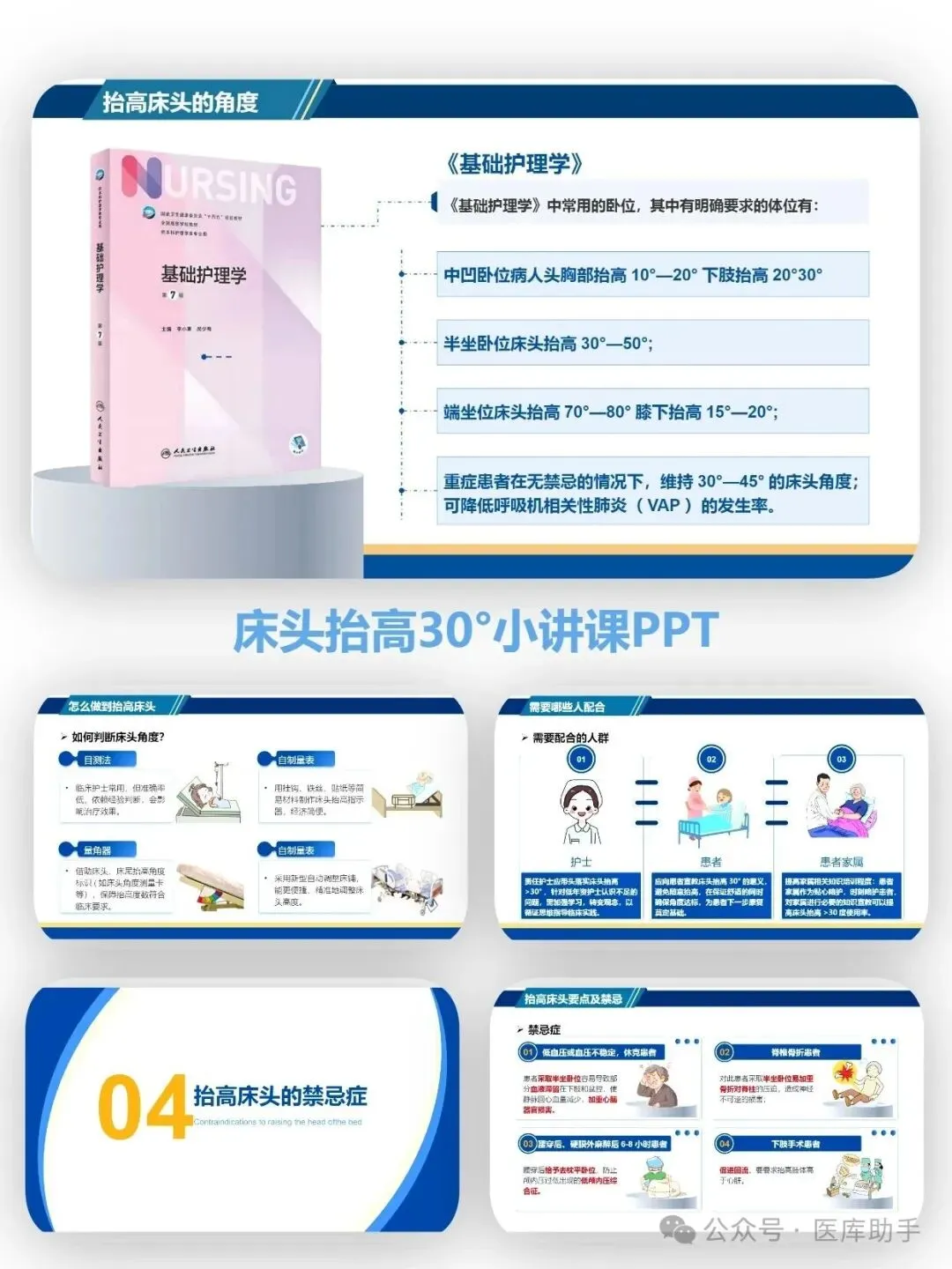 临床执行的三大痛点① 角度不准:目测30°误差大,PPT提供简易测量法(床垫高度≈患者身长1/6)及量角器使用技巧;② 下滑难题:抬高后患者向床尾滑移,详解防滑垫、膝下垫枕、床尾摇高的"三点固定法";③ 禁忌盲区:哪些情况不能抬?低血压休克、脊柱损伤、骨盆骨折等禁忌证一图读懂,避免"一刀切"。