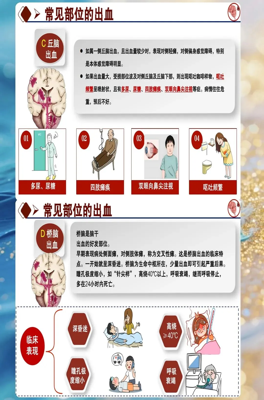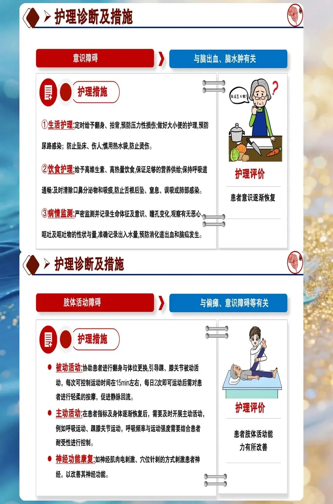 康复护理要从早期开始。很多人认为脑出血患者要等到病情稳定后才开始康复训练,其实早期康复能促进神经功能恢复。护理团队在患者生命体征稳定后四十八小时就开始了床边康复训练,包括良肢位摆放、被动关节活动、坐位平衡训练等。很多人不知道的是,康复训练的强度要循序渐进,不能过度疲劳。这个患者在两周内从卧床到坐起再到站立,神经功能恢复比预期要好。很多人忽视早期康复,认为患者昏迷没有知觉,其实早期康复能为后期恢复打基础。