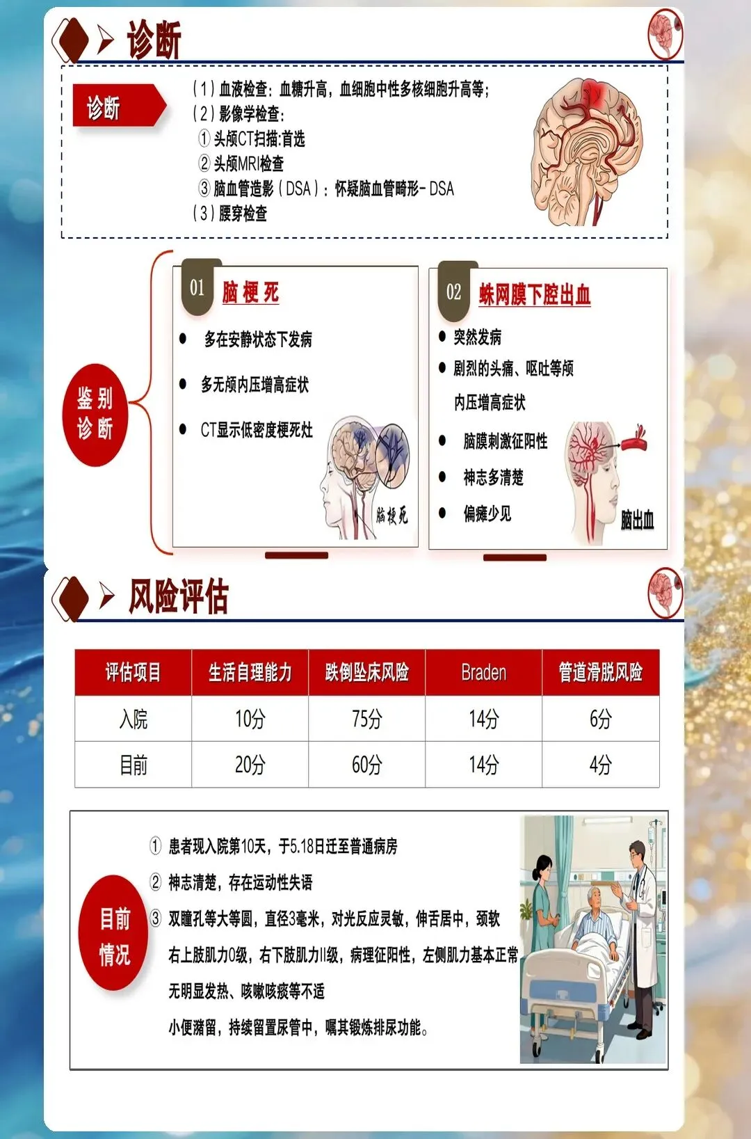 压疮预防要从细节做起。脑出血患者长期卧床,压疮风险很高。护理团队建立了系统的压疮预防方案,包括减压设备、营养支持、皮肤护理、体位摆放等。气垫床是常用设备,但很多人不知道不同类型的气垫床适用不同风险等级的患者。低风险患者用普通床垫可能就够了,超高危患者可能需要交替压力床垫。护理团队每两小时给患者翻身一次,翻身时采用轴线翻身法,保持头颈躯干在一条线上。这个患者住院期间没有出现压疮,体现了预防措施的有效性。