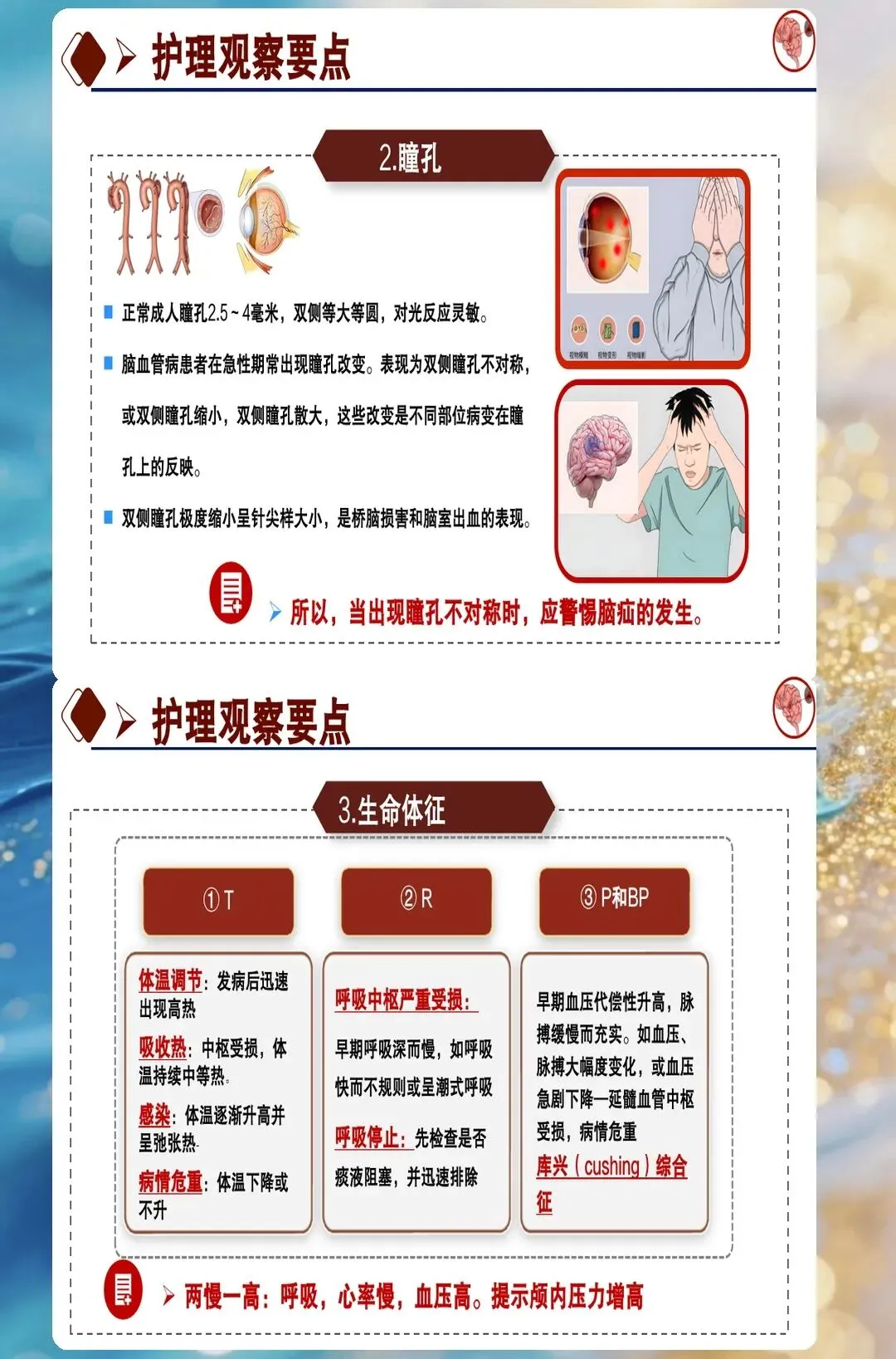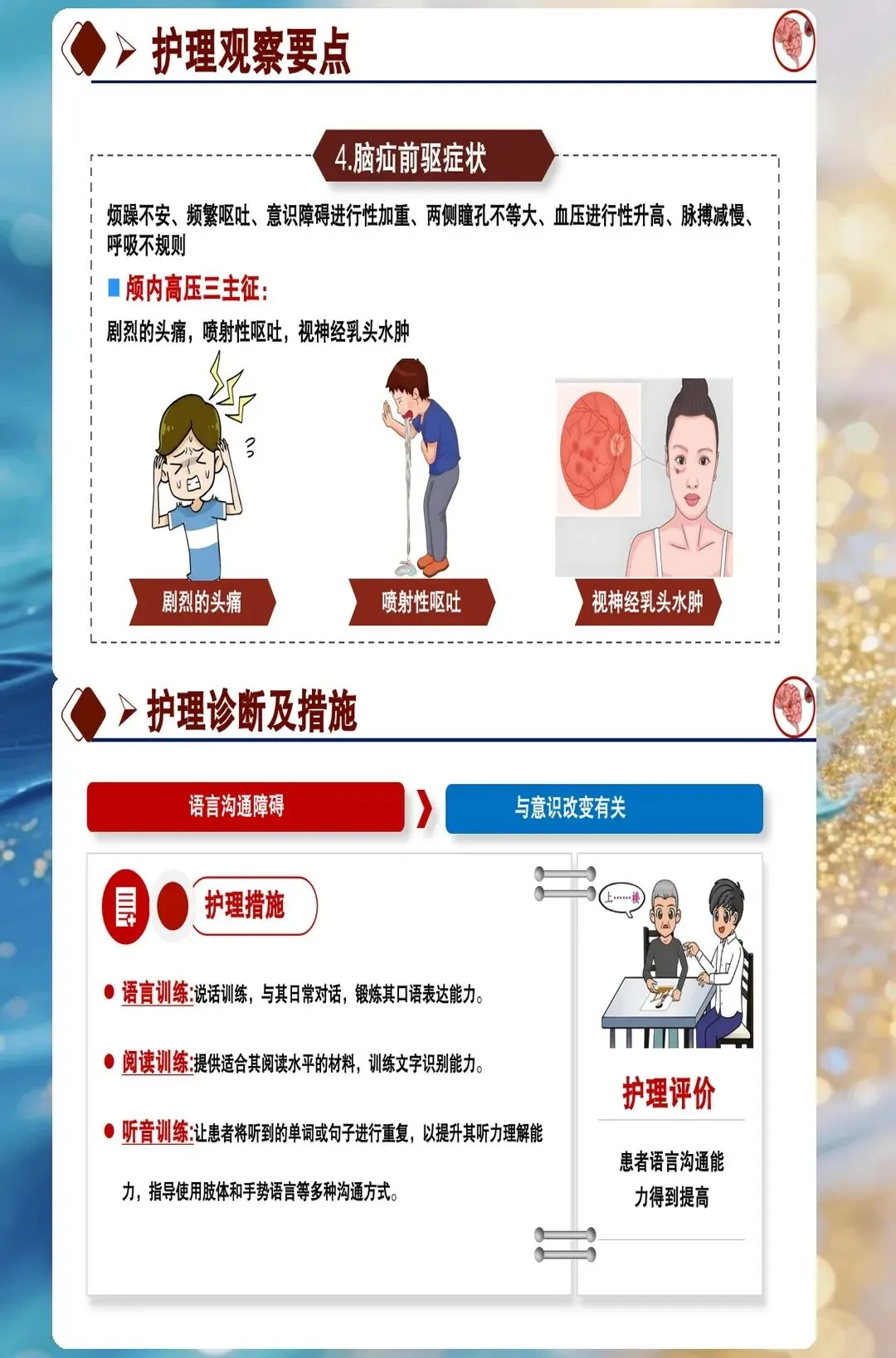 颅内压监测需要护理人员具备敏锐的观察力。脑出血后脑水肿的高峰期在三天到七天,这段时间颅内压会逐渐升高。护理团队每四小时评估一次患者意识状态、瞳孔大小和对光反射,同时监测血压、心率、呼吸的变化。很多人只关注颅内压的数值,其实意识状态的变化更敏感。这个患者在第四天出现了意识模糊、瞳孔不等大,立即报告医生,CT复查发现血肿周围水肿加重,及时调整了脱水治疗方案。很多人不知道的是,抬高床头三十度可以降低颅内压,这是最简单有效的措施,但很多护士只关注药物降颅压,忽略了体位管理。