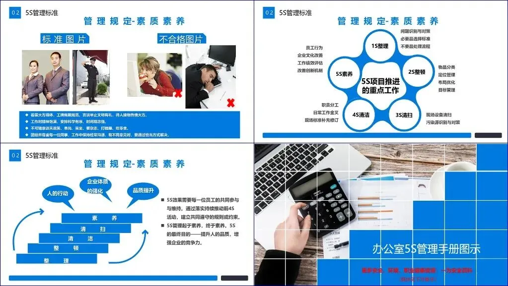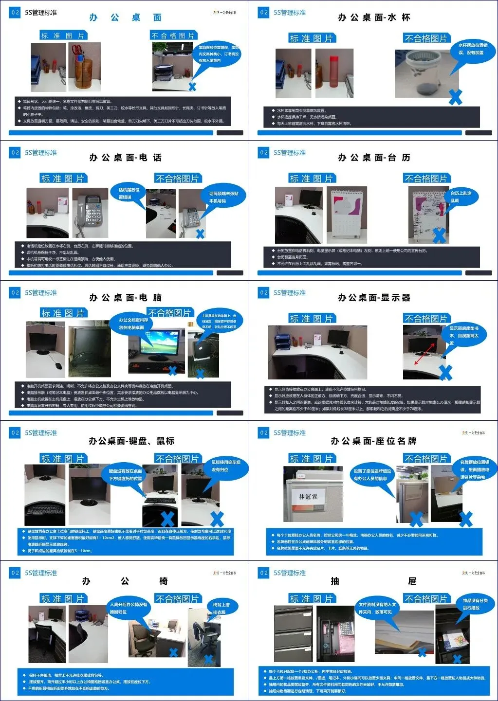 最后,“素养”是5S管理的灵魂所在。手册强调,5S的最终目标是培养员工自觉遵守规范、主动维护秩序的职业习惯。具体行为规范包括:着装整洁、佩戴工牌、使用文明用语、遵守电话礼仪、不在办公区进食或看报、不串岗闲聊等。更重要的是,倡导团队协作精神与规则意识,鼓励员工主动发现问题、提出改进建议。正如手册所言:“5S起于素养,终于素养”——唯有将外在规范转化为内在自觉,才能真正实现管理效能的跃升。