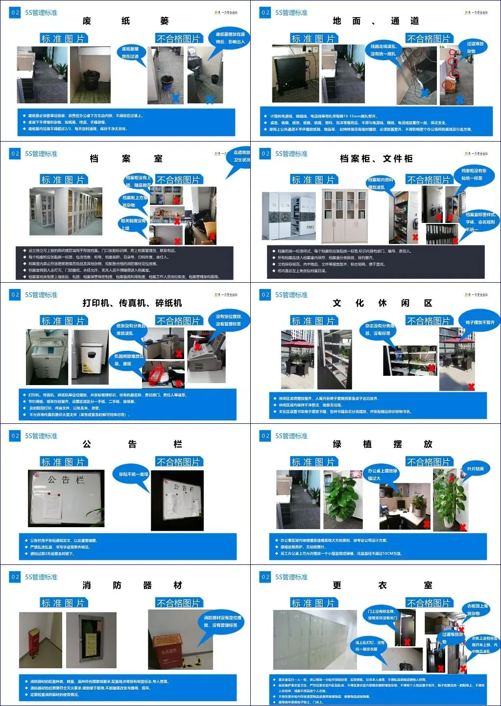 其次,“整顿”强调物品的定位管理与标识清晰。手册对办公桌进行了功能分区设计:显示器居中摆放以符合人体工学;左侧设置标准文件架用于临时文件流转;右侧配置统一规格的笔筒、水杯架、台历座等;电话置于右手侧便于接听。所有物品均需按固定位置摆放,并使用颜色一致、尺寸规范的收纳工具,确保整体视觉协调。此外,公共区域如档案室、打印机区、文化休闲区、更衣室等也设有明确的物品定位图和标签系统,实现“有物必有位,有位必有标”,极大提升了查找效率与使用便利性。