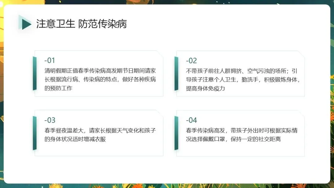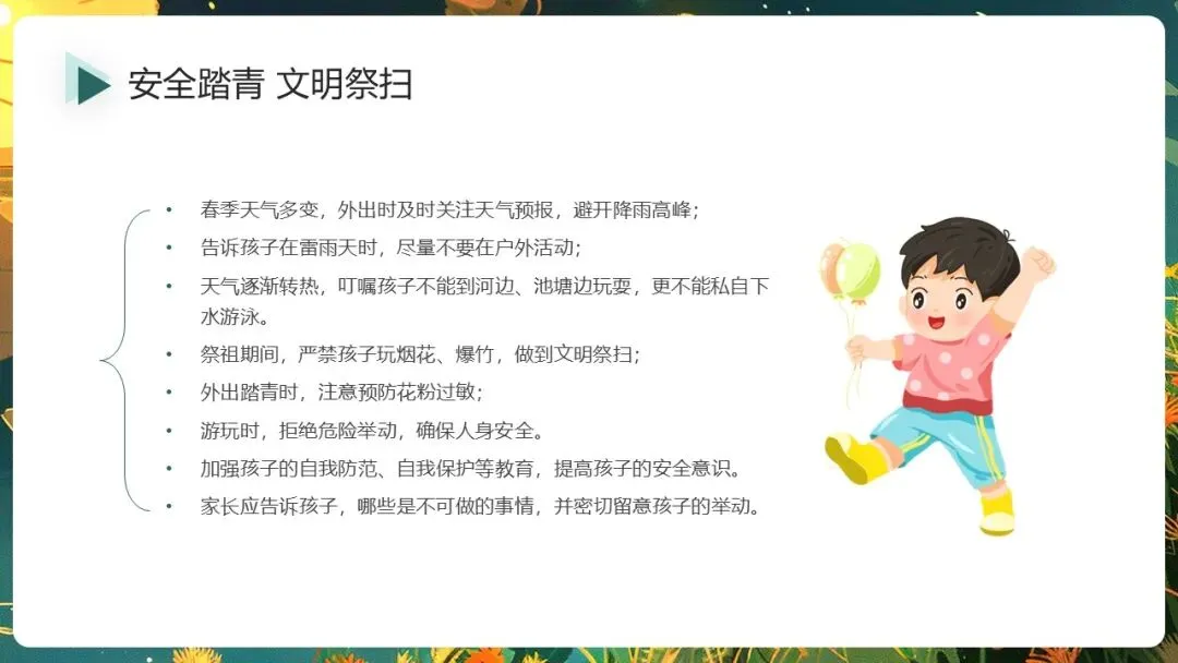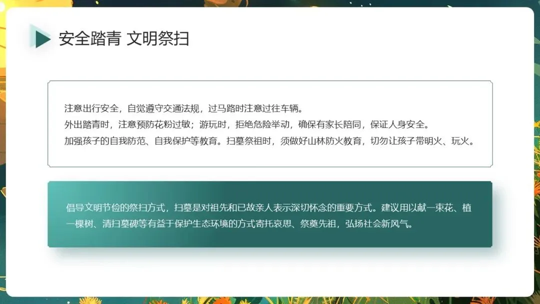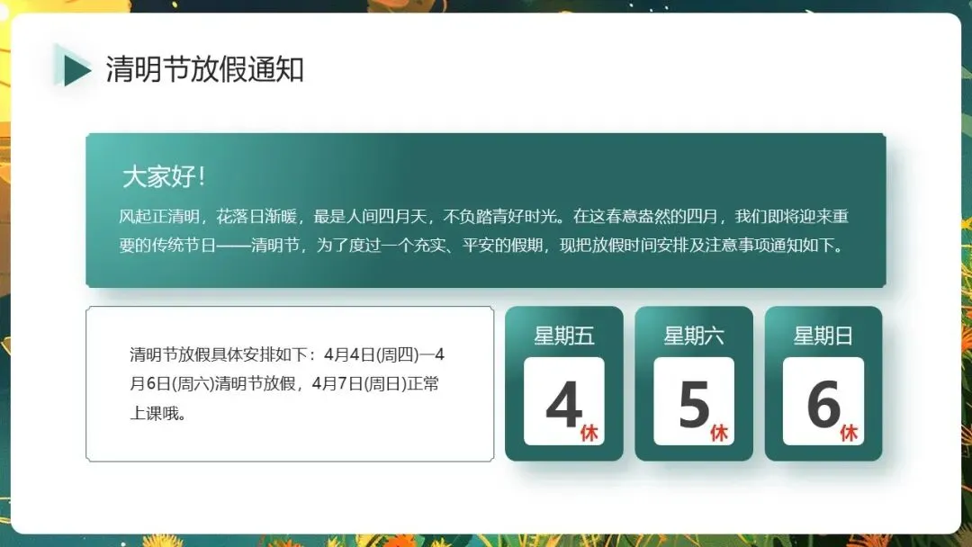 春意盎然的️四月,我们即将迎来重要的传统节日清明节,为了度过一个充实、平安的假期,现把放假时间安排及注意事项通知如下。清明假期至,安全不缺席喔!