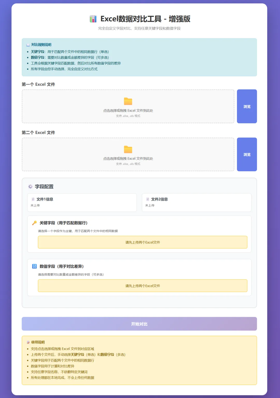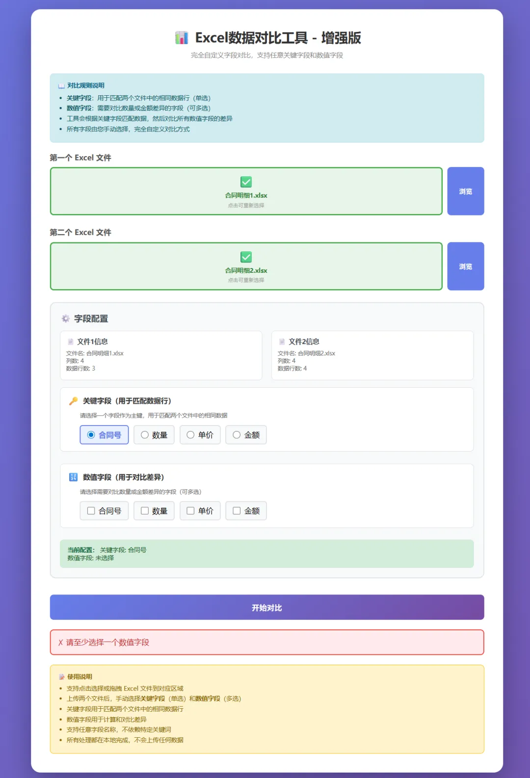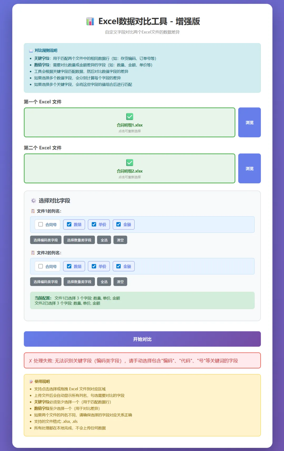 于是呢,又让Claude一顿工作,给输出了一个Excel数据对比工具-增强版,这个工具就变得更智能了呢。