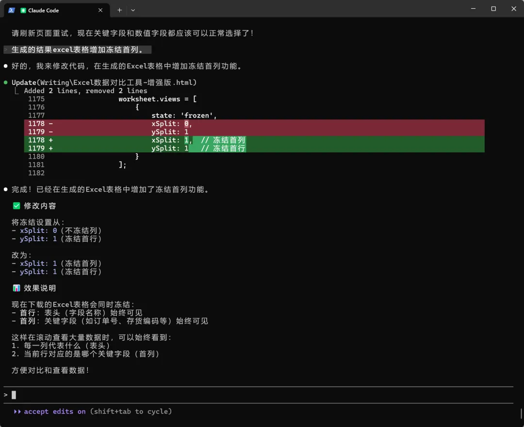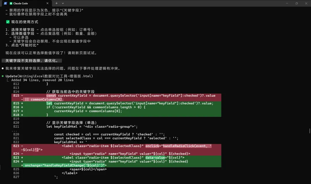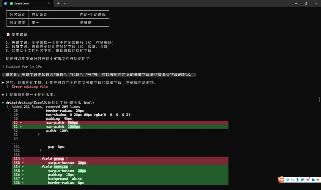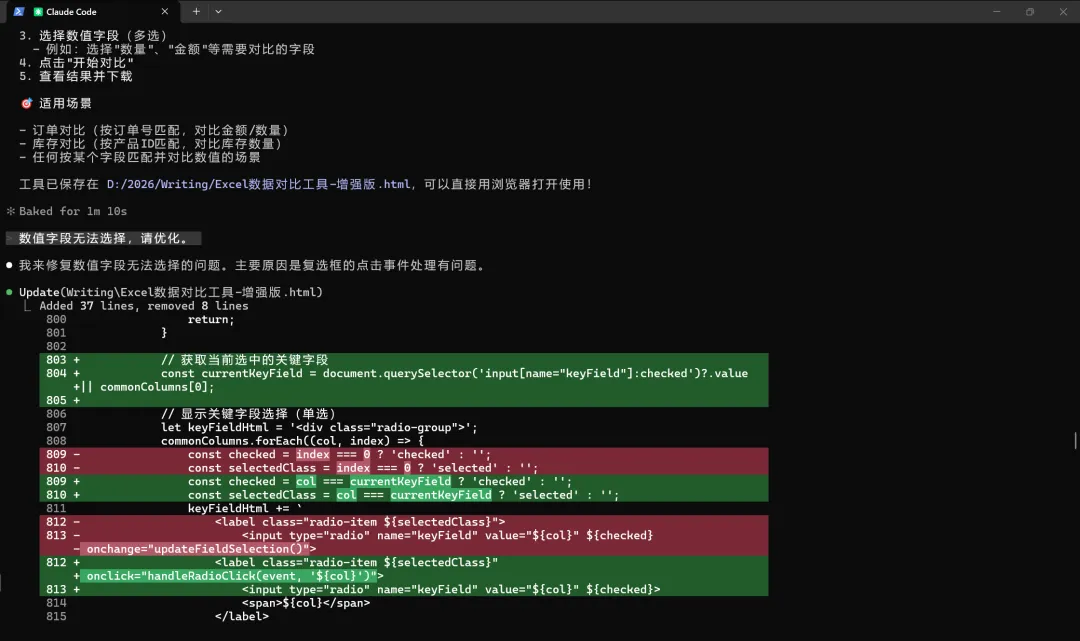 于是呢,又让Claude一顿工作,给输出了一个Excel数据对比工具-增强版,这个工具就变得更智能了呢。