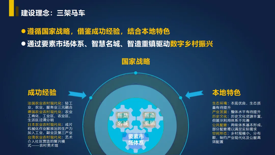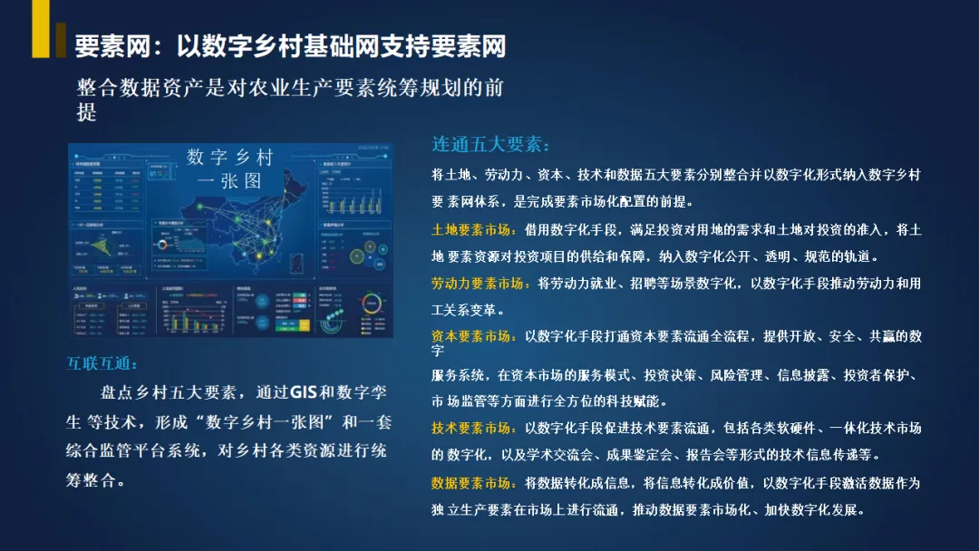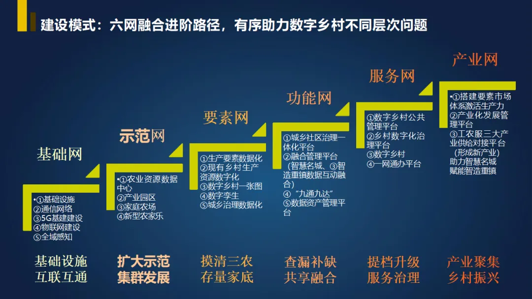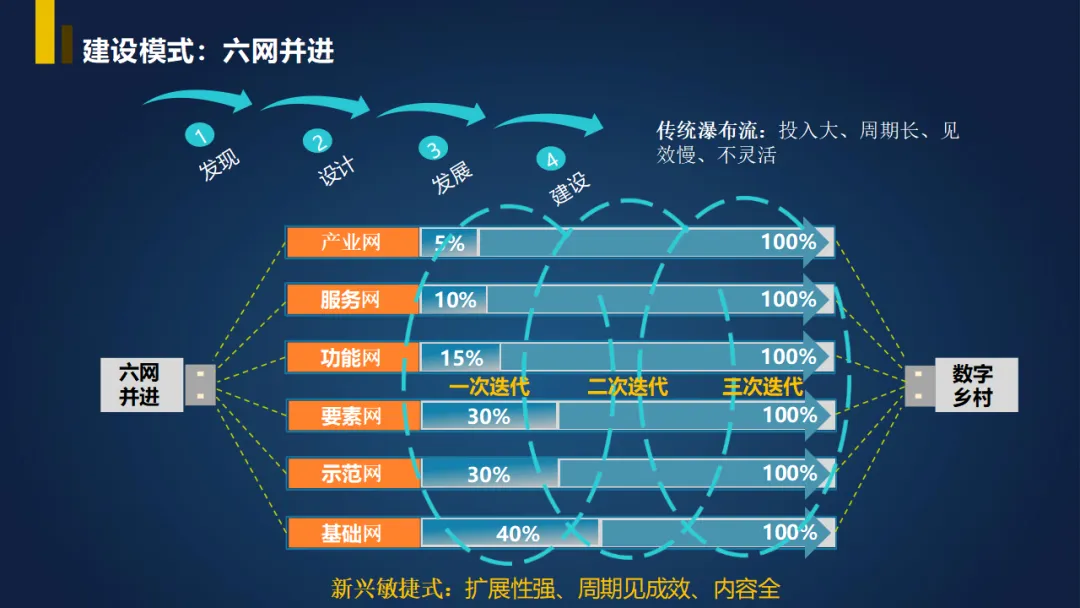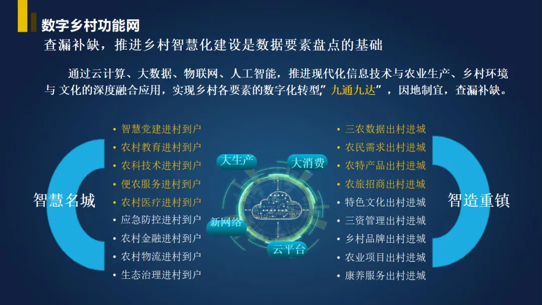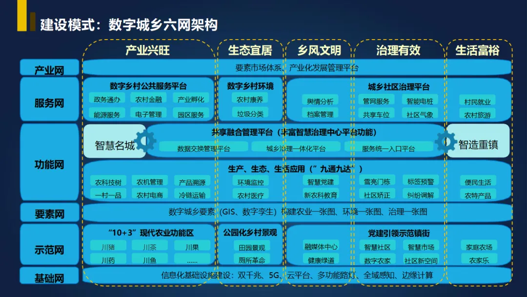 方案采用“六网并进”的建设模式,通过基础网、要素网、功能网、产业网、服务网、示范网的梯度推进与融合进阶,搭建“数据+技术+AI+业务”的一体化架构。核心依托GIS、数字孪生等技术整合土地、劳动力、资本等五大要素,形成“数字乡村一张图”,同时联动智慧名城与智造重镇资源,推动城市红利向乡村溢出。