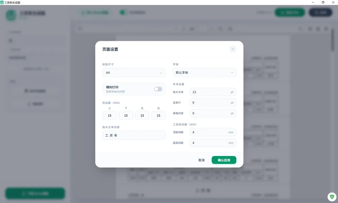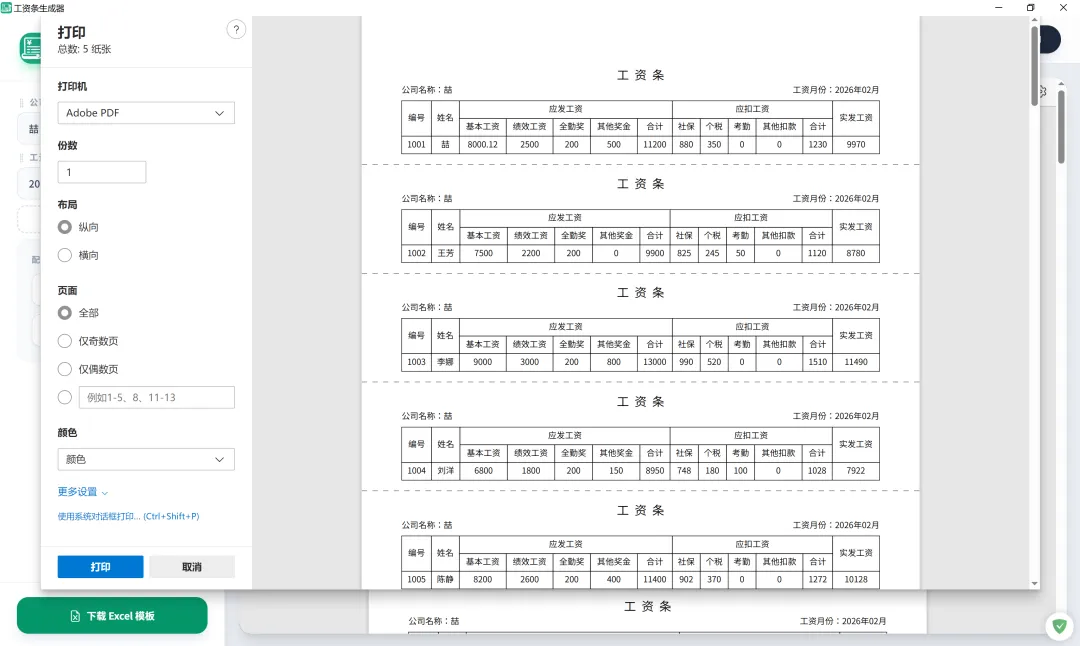 可批量生成所有员工工资条,输出为 Excel 或 Word,打印裁剪更方便。
