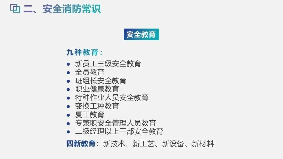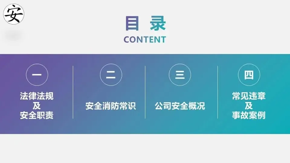 新员工三级安全教育培训(入场级)系统介绍了新员工入职所需掌握的安全知识与公司安全管理体系。内容涵盖四大模块: