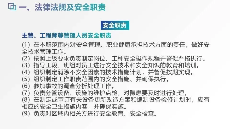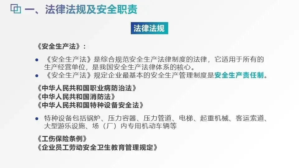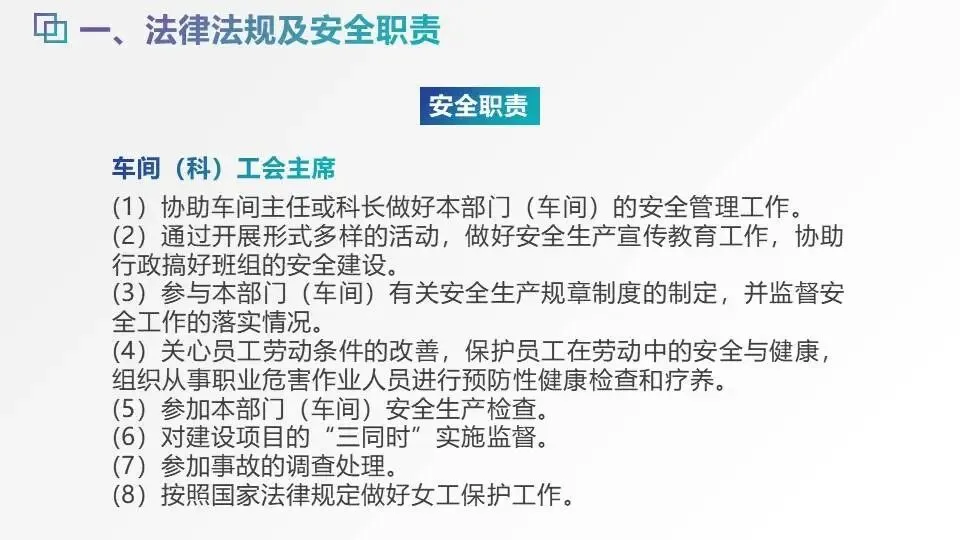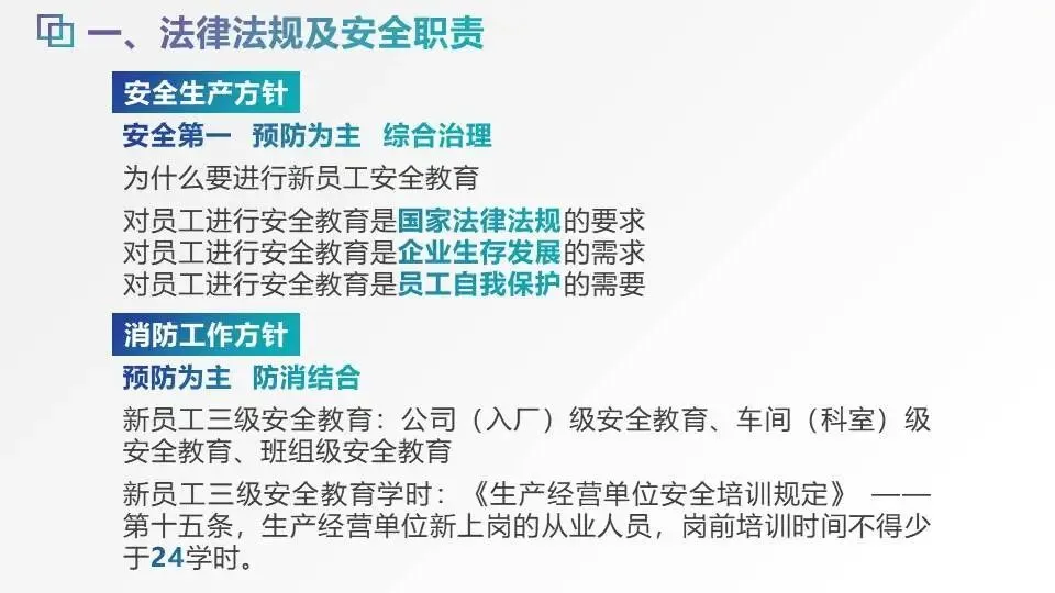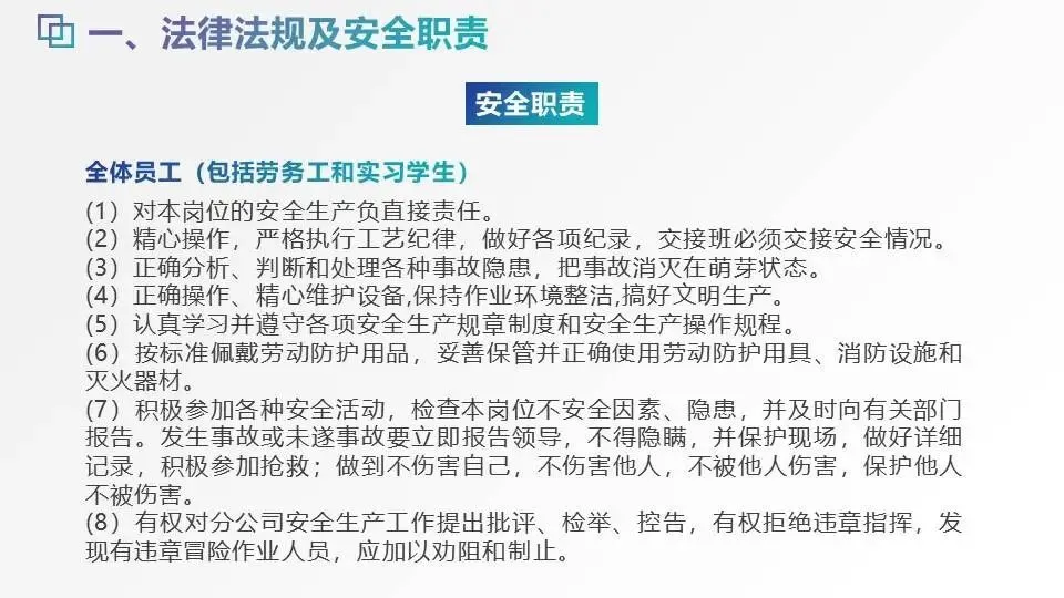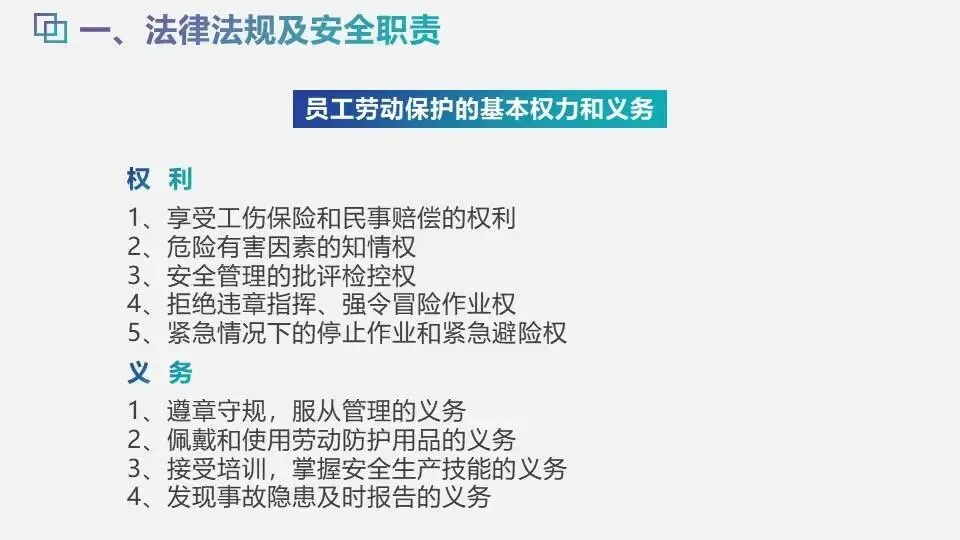 法律法规及安全职责:强调员工在劳动保护中的基本权利与义务,明确安全责任。