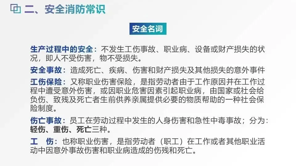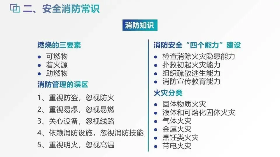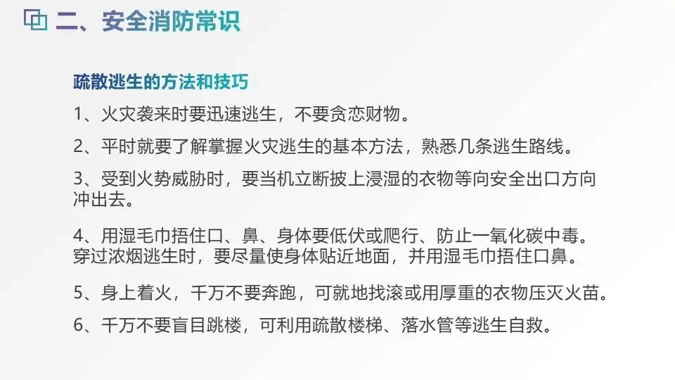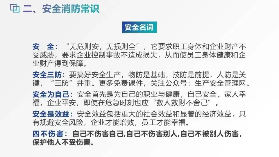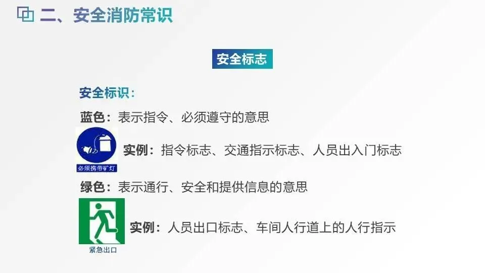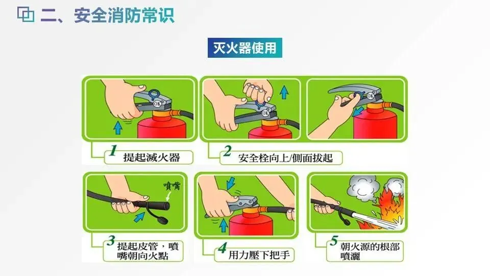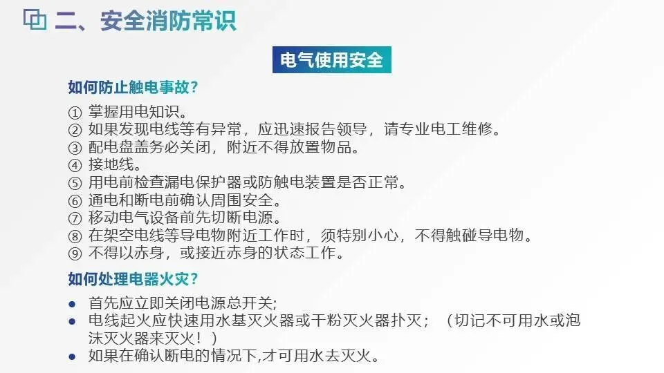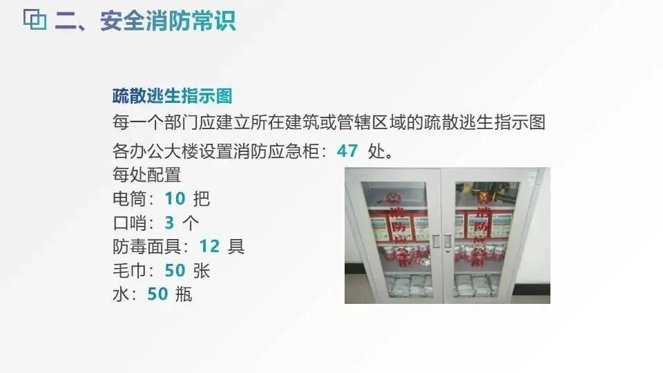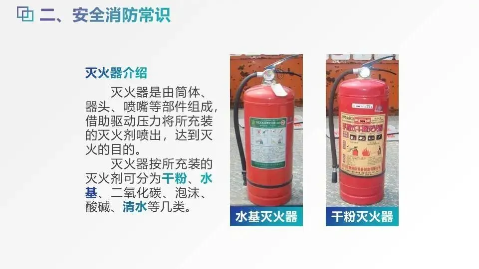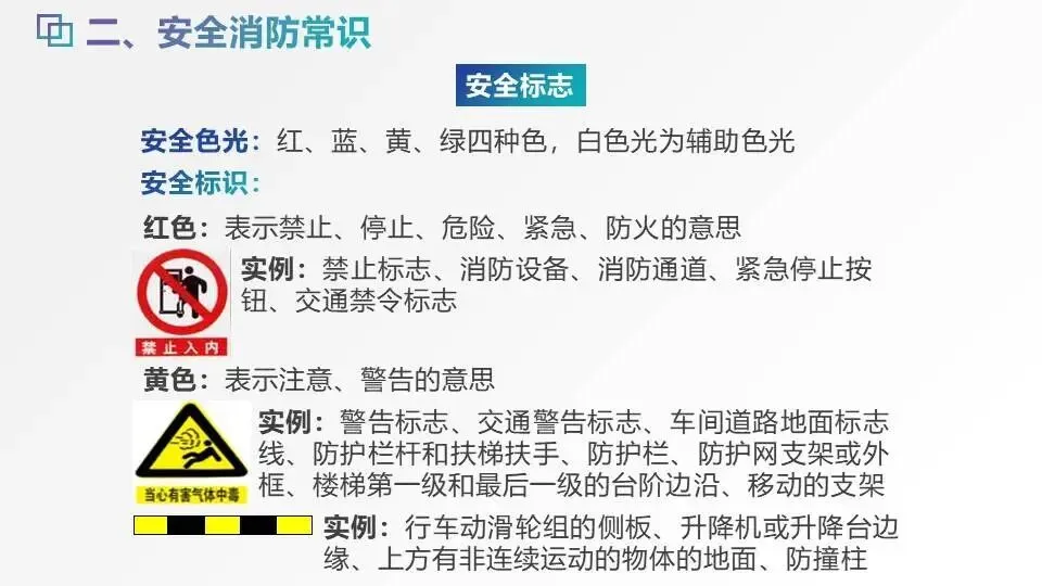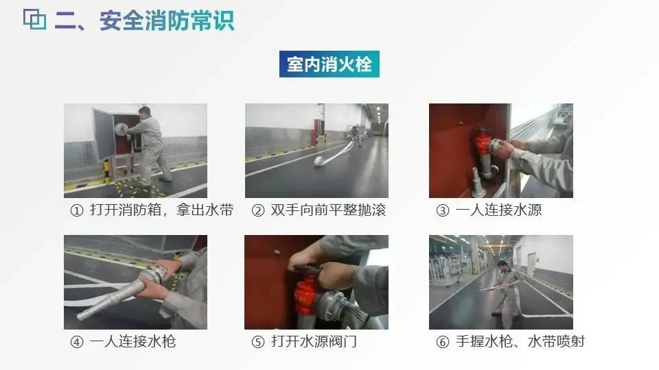 安全消防常识:讲解安全名词、电气使用安全、安全标志、消防知识及灭火器、消火栓的使用方法。