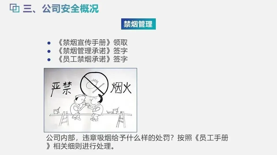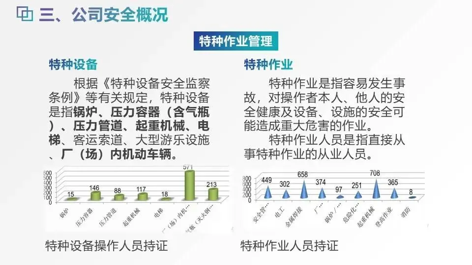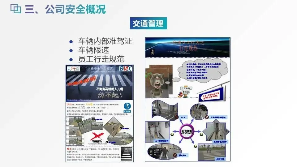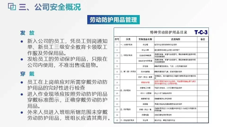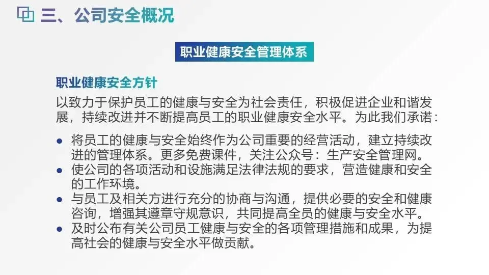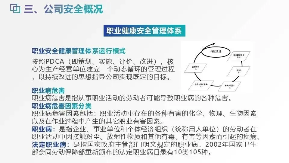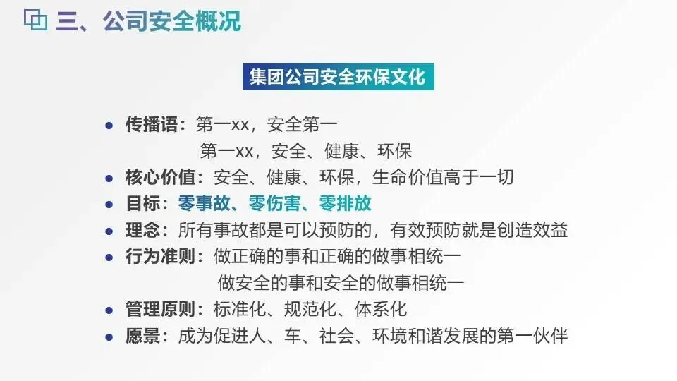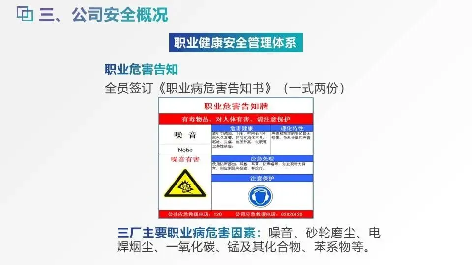 公司安全概况:介绍集团安全文化(如“零事故、零伤害、零排放”目标)、职业健康安全管理体系、职业病危害因素(噪音、粉尘、苯系物等)、应急救援预案、特种作业、危化品管理、劳动防护用品及交通、禁烟等管理制度。