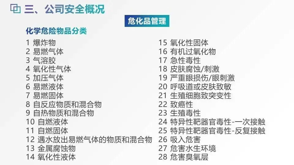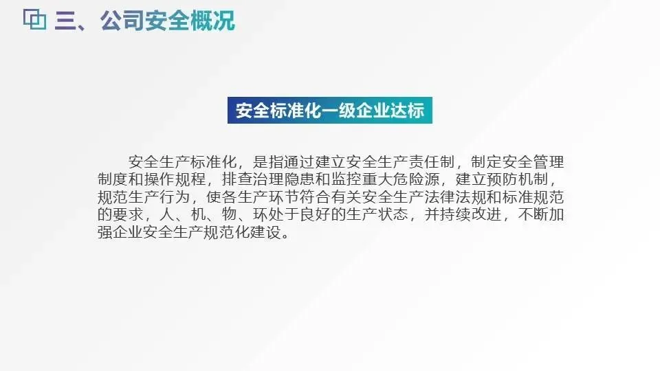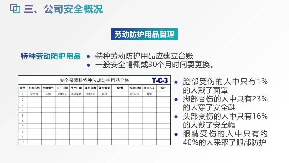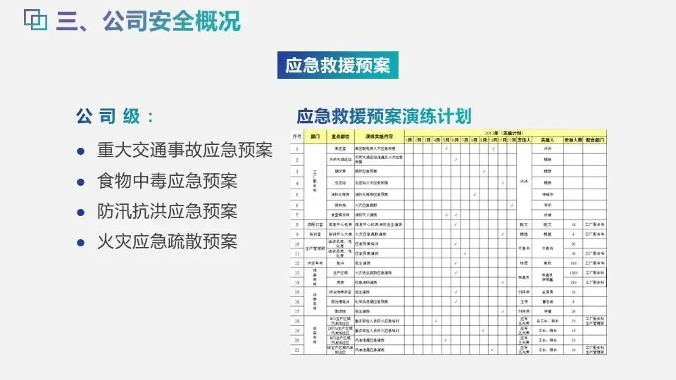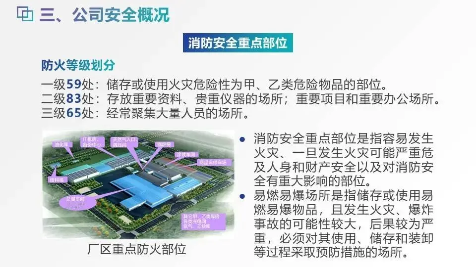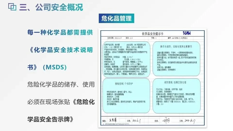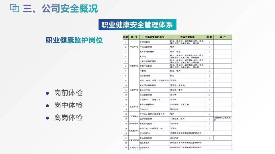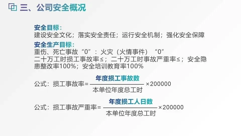 公司安全概况:介绍集团安全文化(如“零事故、零伤害、零排放”目标)、职业健康安全管理体系、职业病危害因素(噪音、粉尘、苯系物等)、应急救援预案、特种作业、危化品管理、劳动防护用品及交通、禁烟等管理制度。