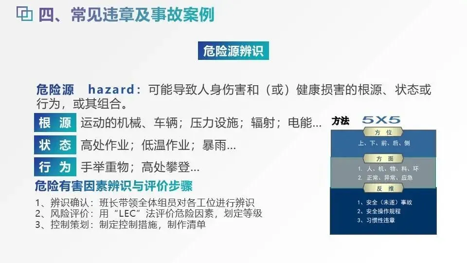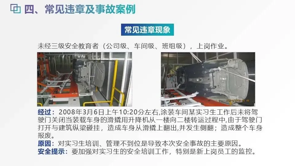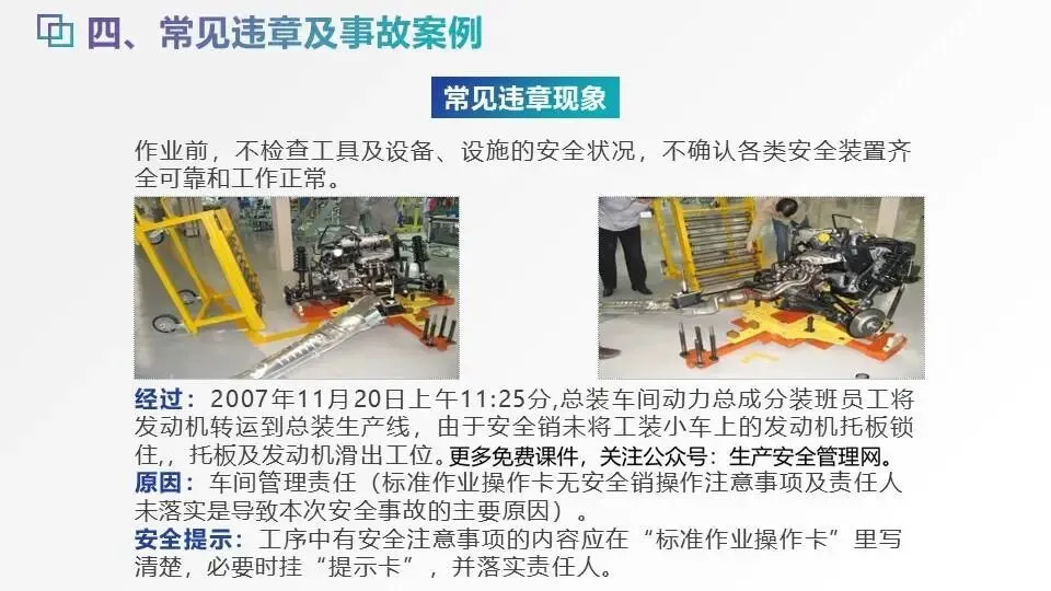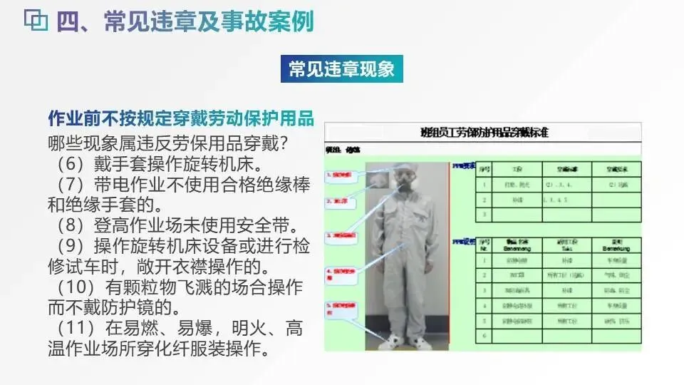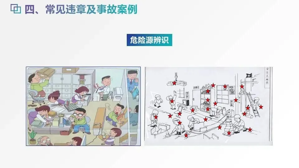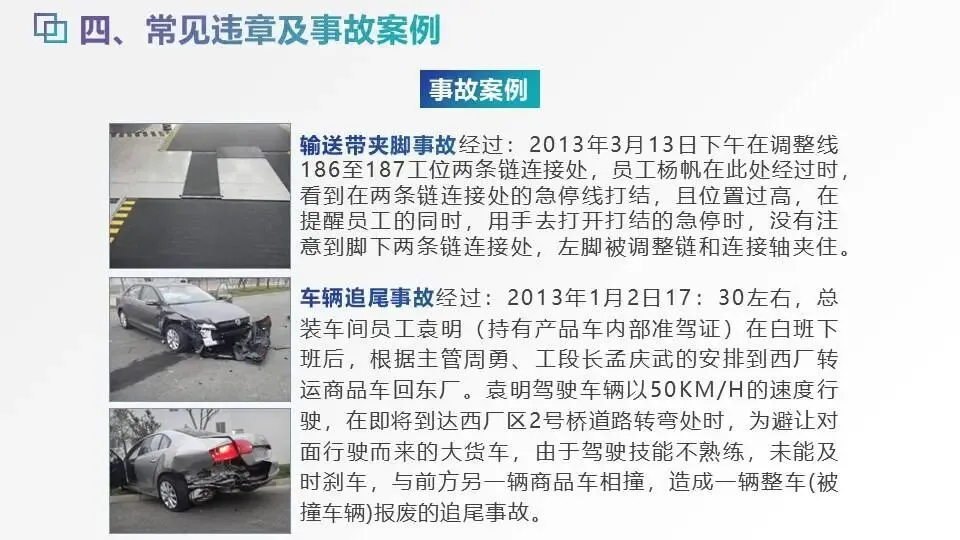 常见违章及事故案例:通过危险源辨识、典型违章行为和真实事故案例,强化员工对安全隐患的警觉性。