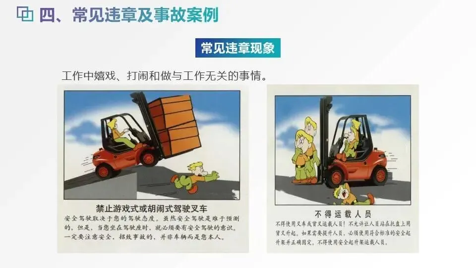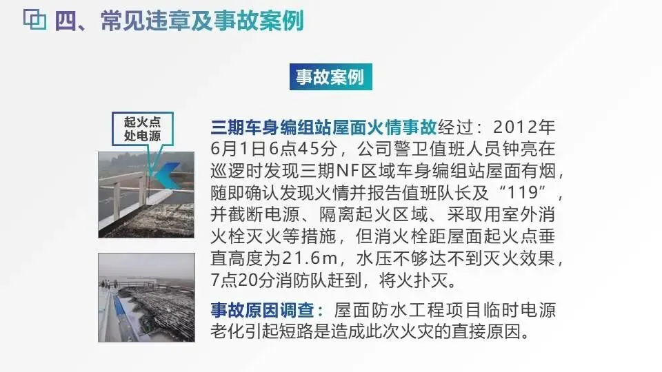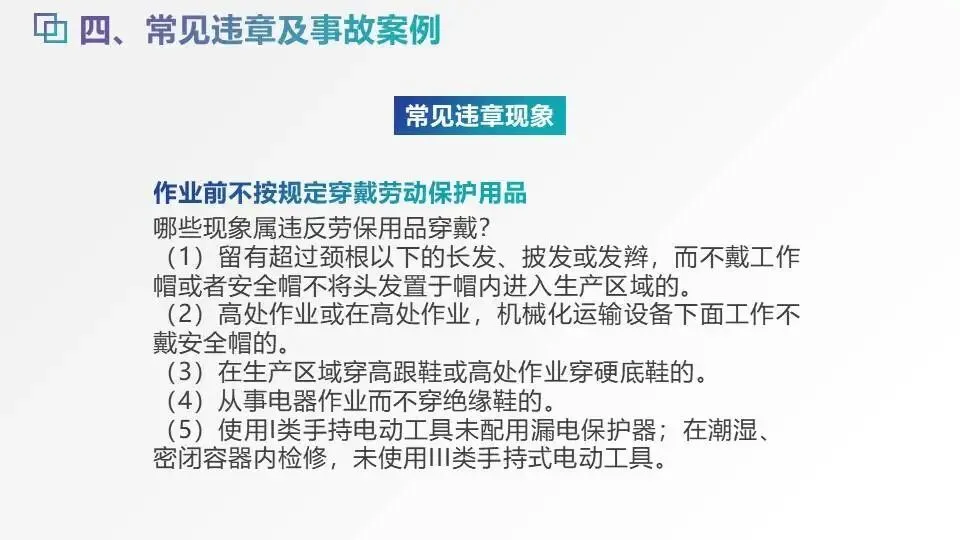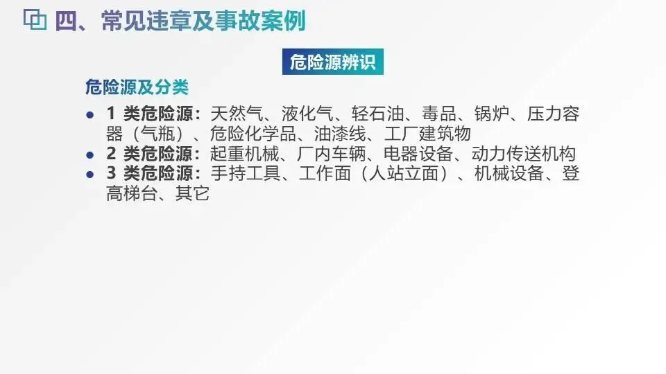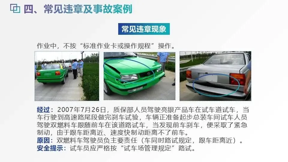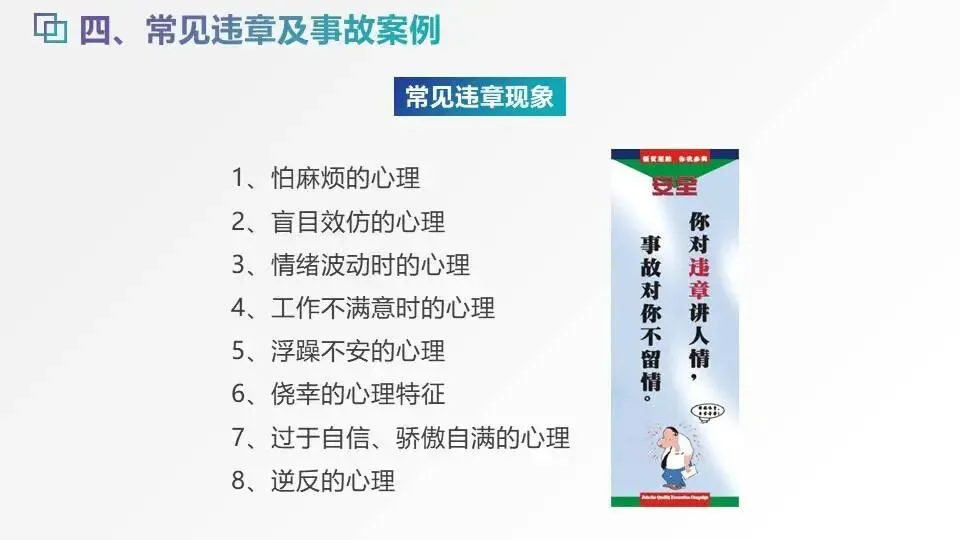 常见违章及事故案例:通过危险源辨识、典型违章行为和真实事故案例,强化员工对安全隐患的警觉性。