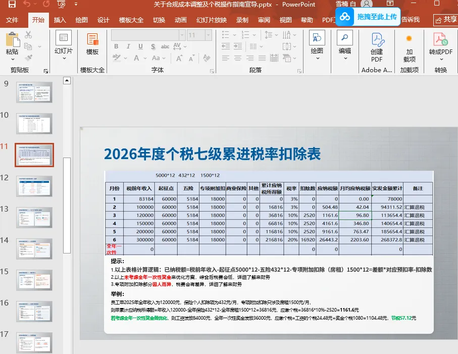 AI给的版本很通用,换了任何一家公司都能用。但我需要在PPT里体现公司员工的适用性-比如都是年轻小孩儿们,目前涉及的扣除一般只有社保和租房、额外还可以用税优保险和个人养老金来增加扣除项,以及全年一次性奖金的合理运用,公司内部咨询渠道等信息。