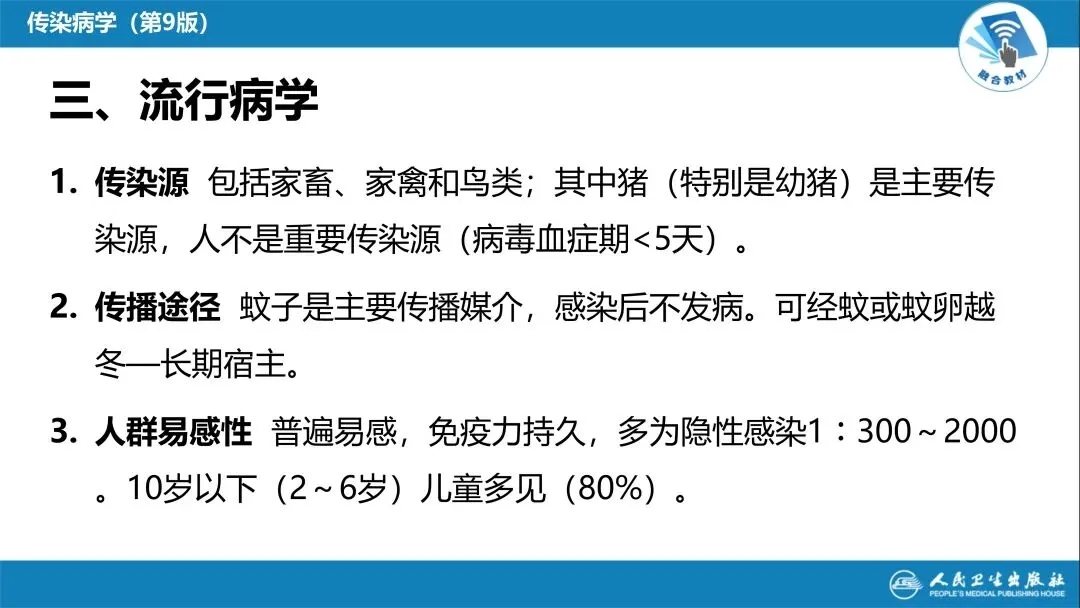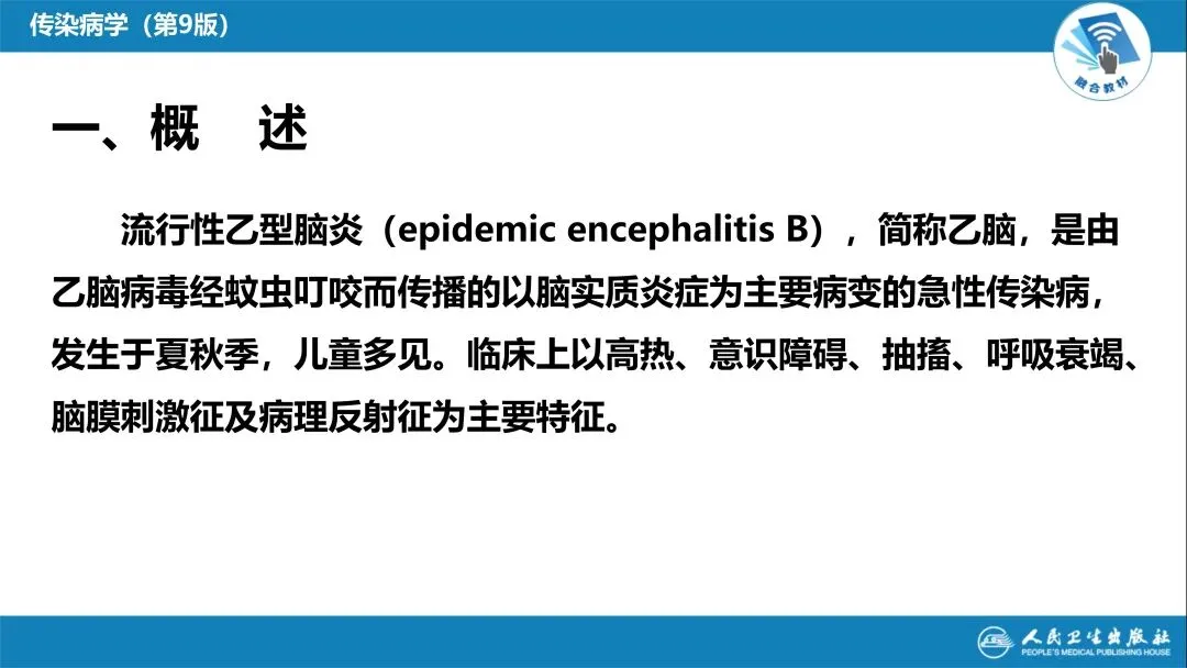 今天给大家带来《流行性乙型脑炎》精品 PPT,紧扣人卫版传染病学第 9 版教材,由中南大学专业师资编写,从概述、病原学、流行病学,到发病机制、病理解剖,再到临床表现、诊断鉴别、治疗预防,十大核心板块层层拆解,把乙脑的核心考点、临床要点讲得明明白白。