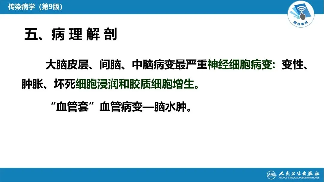 PPT 里不仅有系统的理论知识梳理,还标注了临床关键特征,比如乙脑极期的高热、意识障碍、呼吸衰竭等典型表现,不同临床类型的鉴别要点,还有脑脊液检查、血清学诊断等实验室关键指标,甚至附带了病理影像、镜下病变图,图文结合更易理解。
