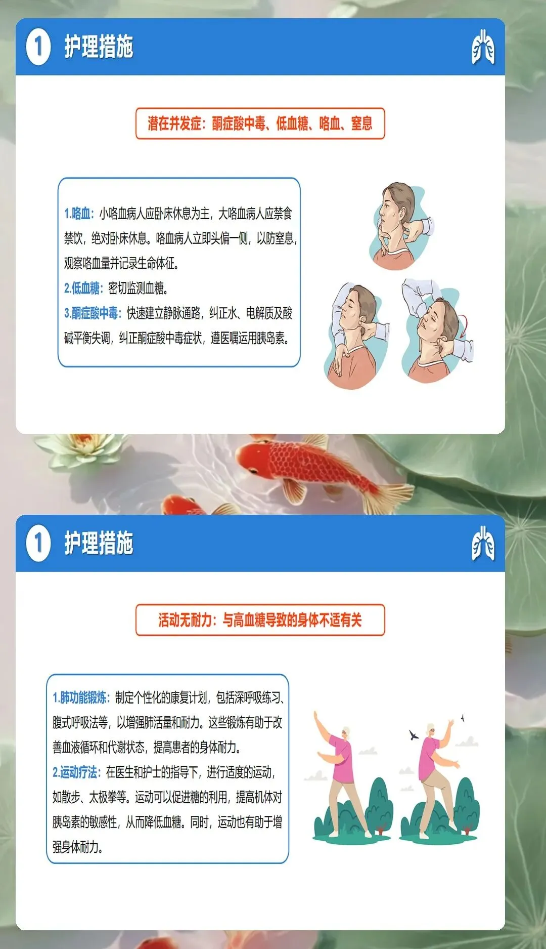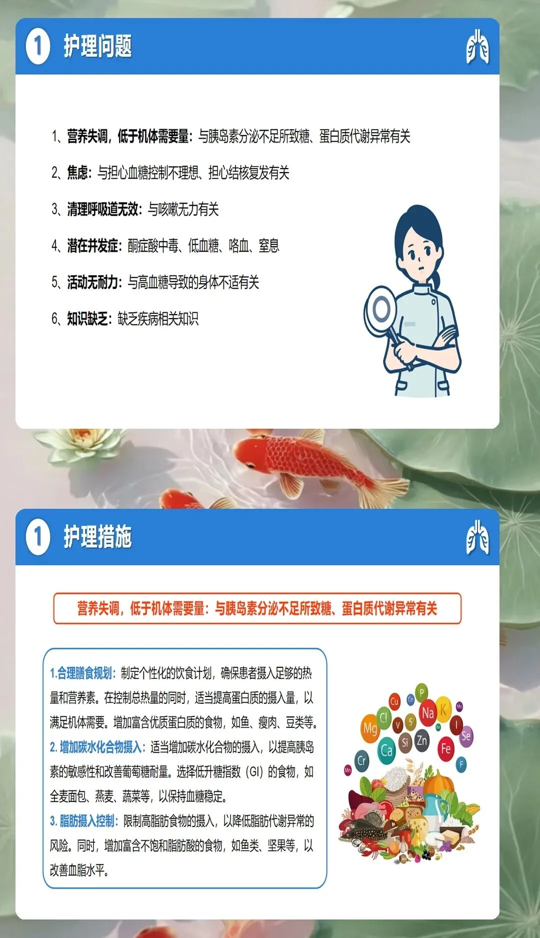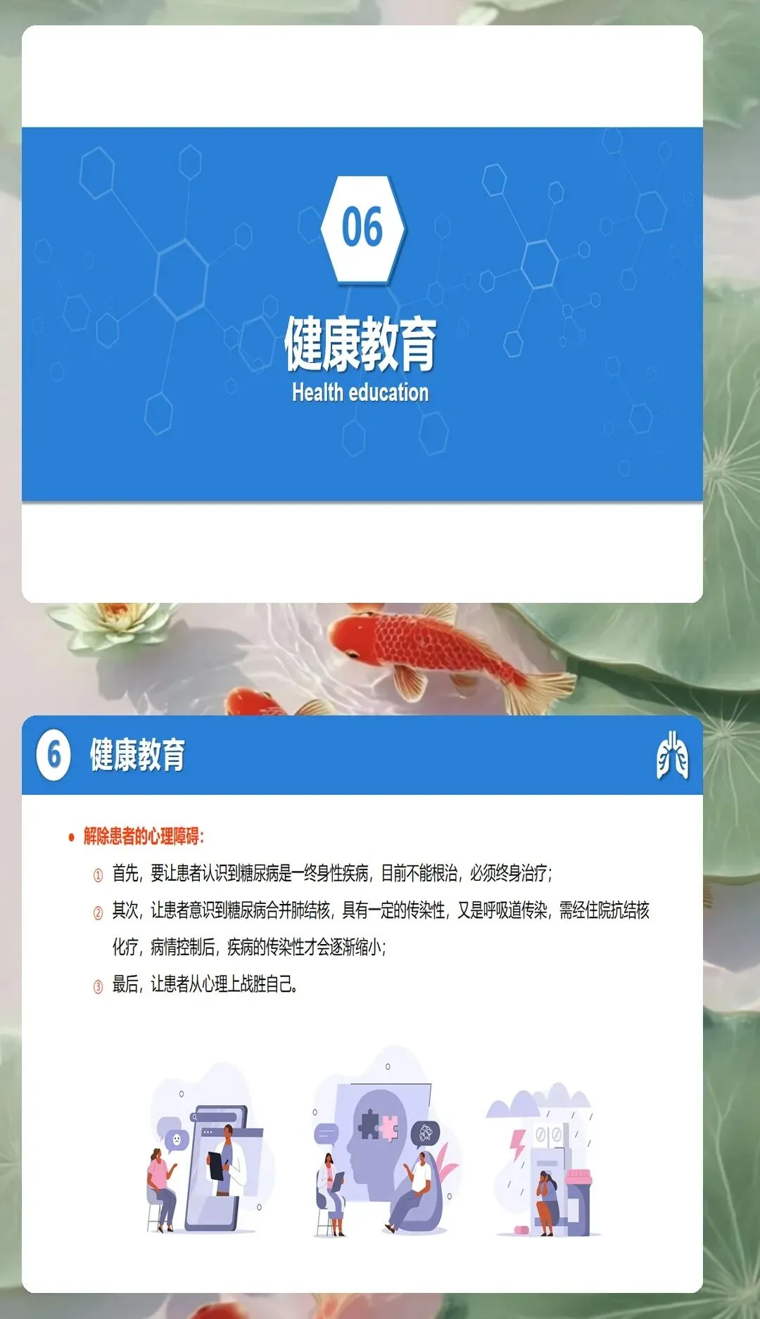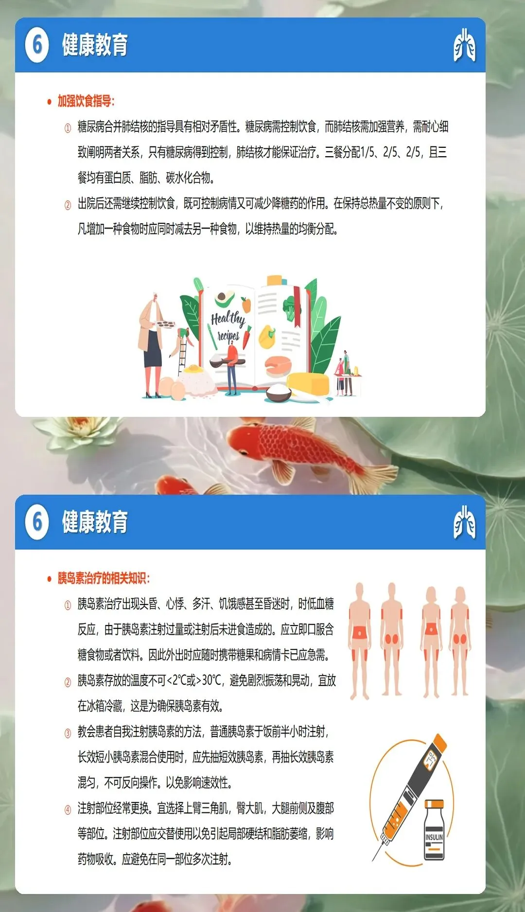 血糖管理是糖尿病护理的核心内容。肺结核患者的血糖控制目标与非糖尿病患者有所不同,需要平衡感染控制、药物疗效和低血糖风险。我们制定的目标血糖范围是空腹7.8至10.0mmolL,餐后2小时不超过11.1mmolL。监测频次为每日七次指尖血糖,包括三餐前、三餐后2小时和睡前,必要时加测凌晨2点血糖。胰岛素治疗采用基础加餐时方案,根据血糖监测结果动态调整剂量。低血糖预防是血糖管理的重要组成部分,建立低血糖风险评估表,对高风险患者加强监测。一旦血糖低于3.9mmolL,立即给予口服葡萄糖或静脉推注50%葡萄糖液,同时寻找低血糖原因,调整治疗方案。护理人员需要掌握各种降糖药物的特点和注意事项,确保用药安全有效。