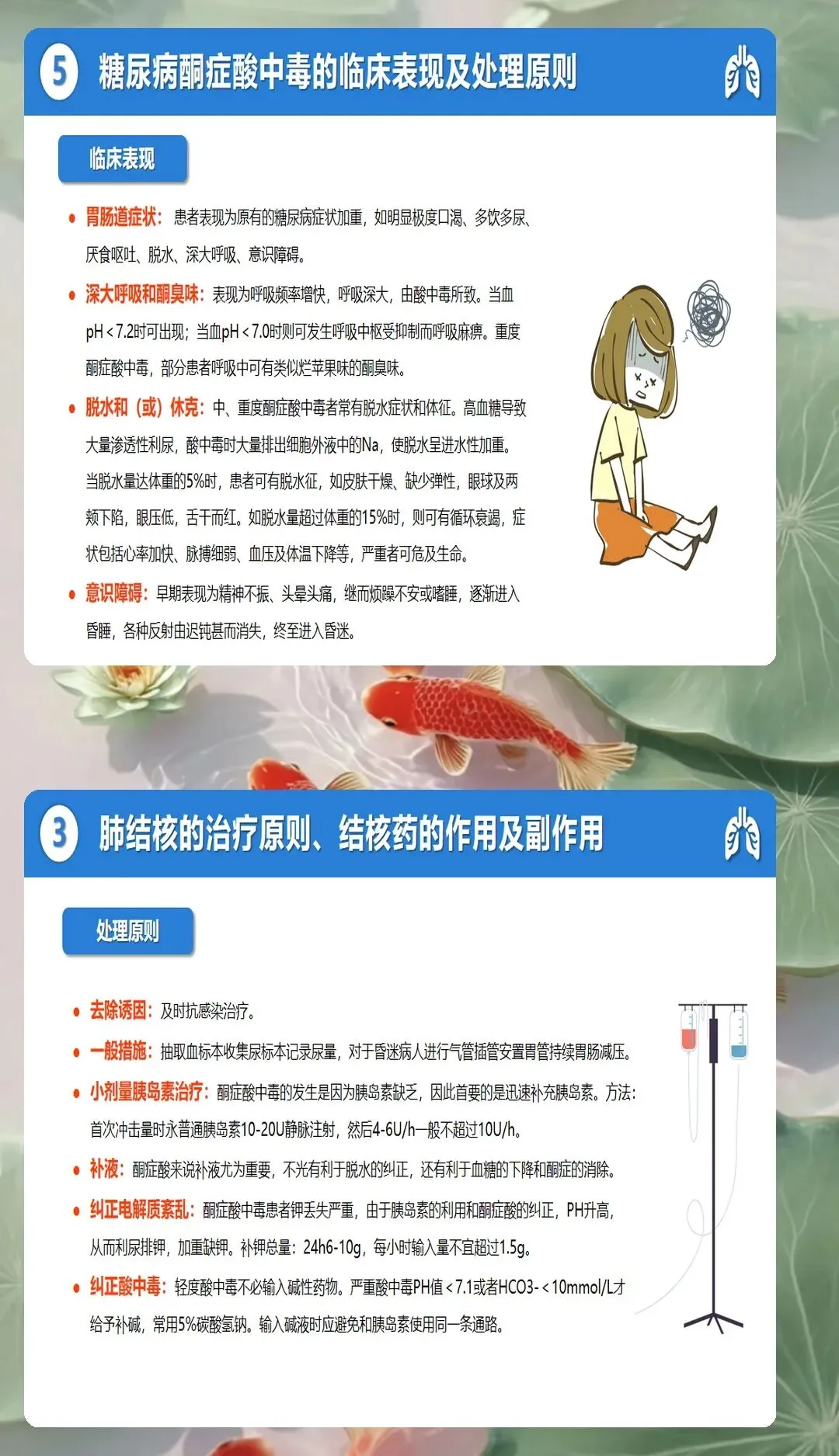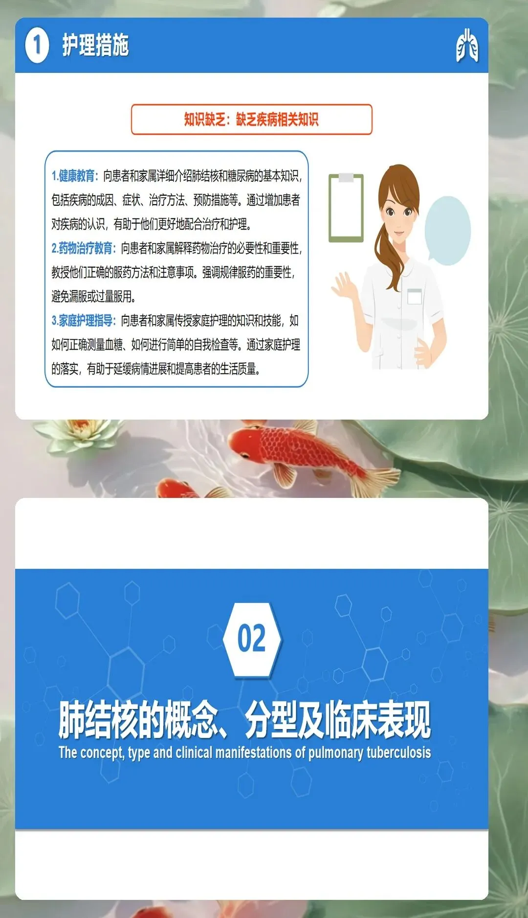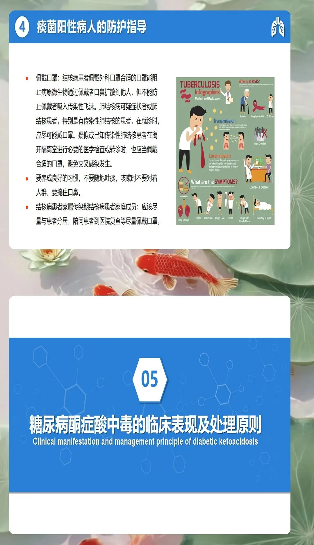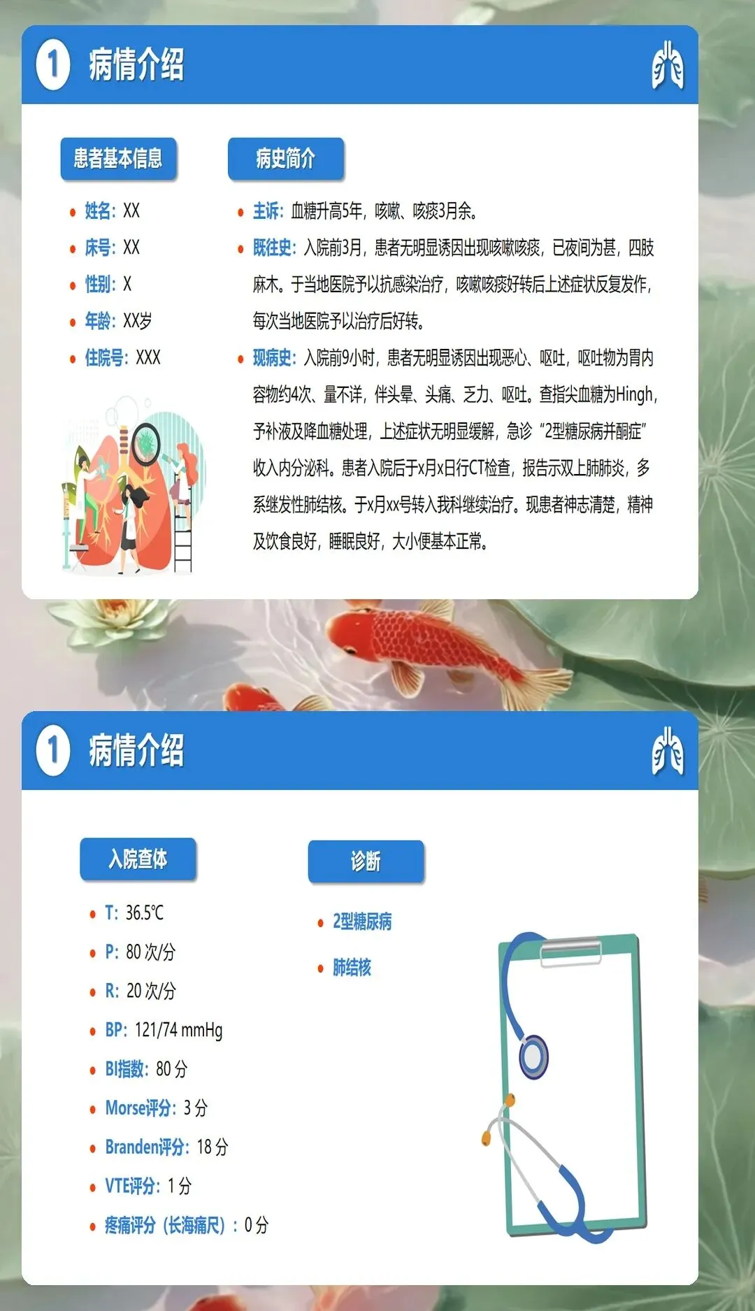 血糖管理是糖尿病护理的核心内容。肺结核患者的血糖控制目标与非糖尿病患者有所不同,需要平衡感染控制、药物疗效和低血糖风险。我们制定的目标血糖范围是空腹7.8至10.0mmolL,餐后2小时不超过11.1mmolL。监测频次为每日七次指尖血糖,包括三餐前、三餐后2小时和睡前,必要时加测凌晨2点血糖。胰岛素治疗采用基础加餐时方案,根据血糖监测结果动态调整剂量。低血糖预防是血糖管理的重要组成部分,建立低血糖风险评估表,对高风险患者加强监测。一旦血糖低于3.9mmolL,立即给予口服葡萄糖或静脉推注50%葡萄糖液,同时寻找低血糖原因,调整治疗方案。护理人员需要掌握各种降糖药物的特点和注意事项,确保用药安全有效。