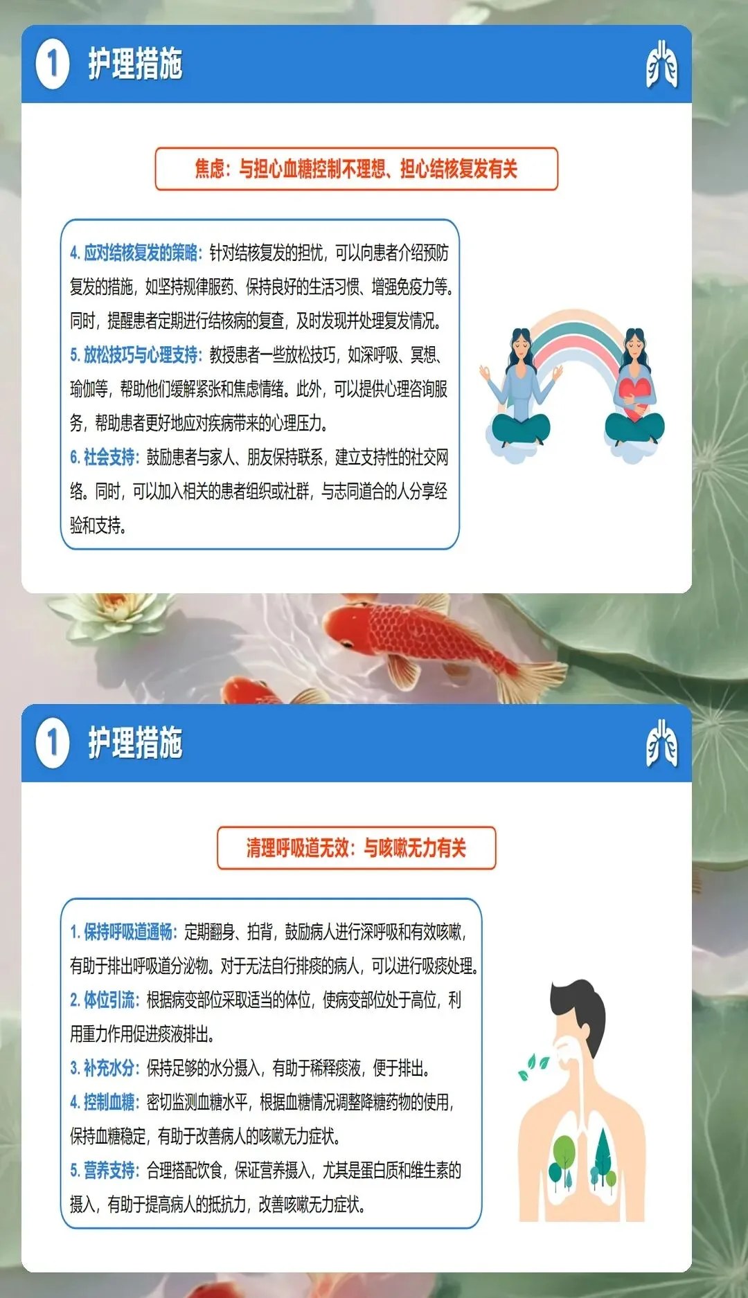 护理评估采用系统化方法,从生理、心理、社会、行为四个维度全面了解患者状况。生理评估重点包括呼吸系统状况、血糖代谢状态、营养状况和药物不良反应监测。呼吸系统评估监测体温、咳嗽咳痰性质和量、呼吸困难程度、咯血风险,每日记录痰液颜色性状,定期进行痰涂片和痰培养检查。血糖代谢评估采用动态血糖监测联合指尖血糖监测,全面了解血糖波动规律,识别低血糖和高血糖风险,为胰岛素治疗调整提供依据。营养状况评估采用主观整体评估法,监测体重变化、白蛋白、前白蛋白等营养指标,制定个体化营养支持方案。药物不良反应监测重点关注抗结核药物和降糖药物的不良反应,及时识别和处理。