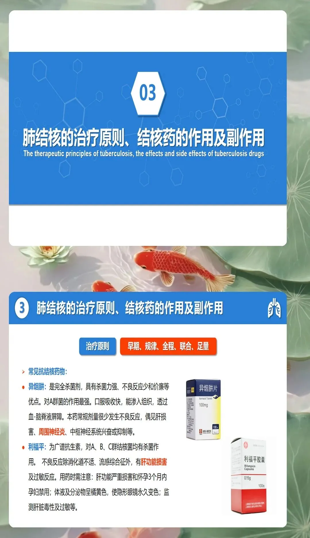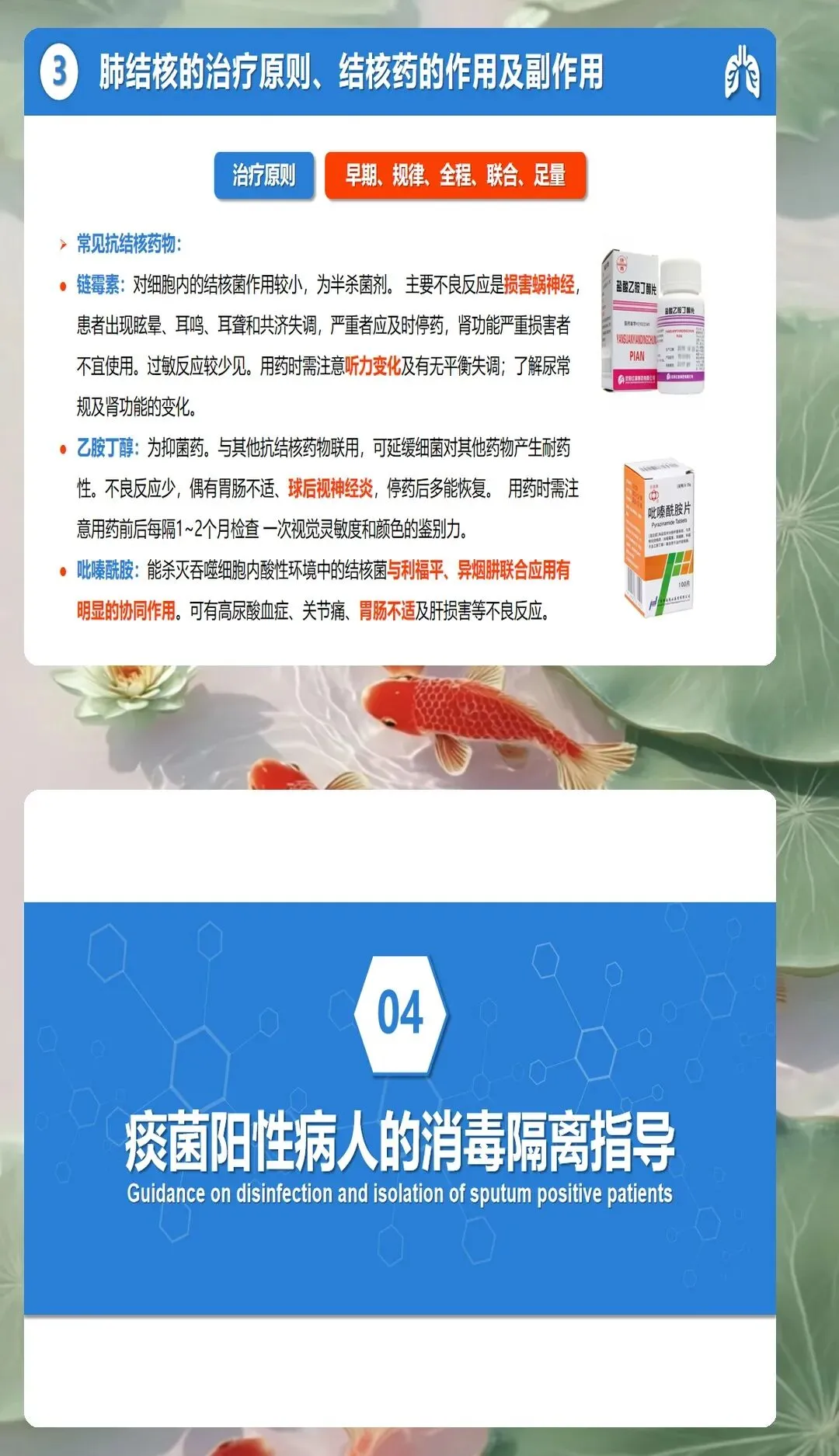 药物治疗管理涉及抗结核药物和降糖药物两类,药物相互作用和不良反应增加护理难度。抗结核治疗采用标准方案,异烟肼、利福平、吡嗪酰胺、乙胺丁醇联合使用,疗程6至9个月。护理人员需要掌握各种药物的作用机制、用法用量、常见不良反应和注意事项。异烟肼可能导致周围神经炎,需要补充维生素B6预防,利福平可能加重糖尿病,需要密切监测血糖变化,吡嗪酰胺可能导致高尿酸血症,需要监测尿酸水平,乙胺丁醇可能引起视神经炎,需要定期检查视力。降糖药物需要根据血糖监测结果调整剂量和种类,避免与抗结核药物产生不良相互作用。建立用药教育清单,教会患者认识药物名称、作用、用法、不良反应和处理方法,提高用药依从性。
