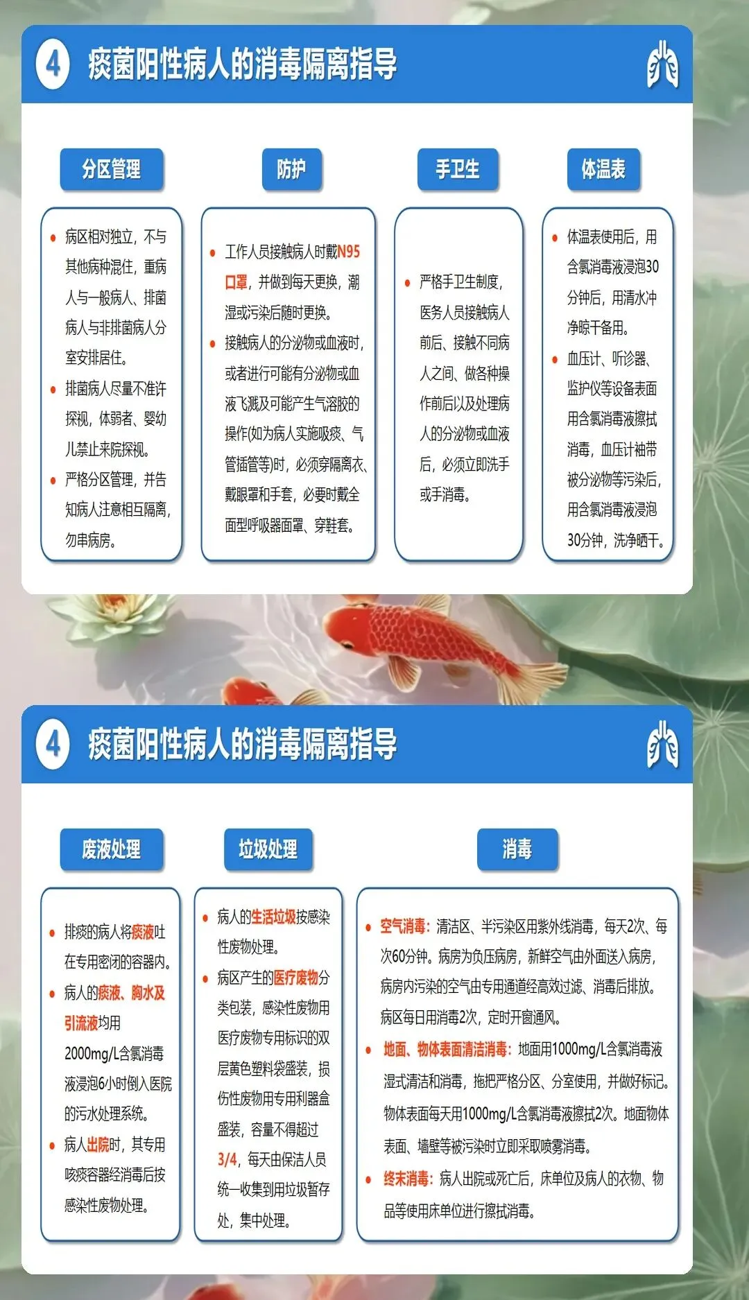 隔离管理是肺结核护理的核心环节。根据传染性评估结果,患者痰菌阳性,需要实施呼吸道隔离。安置在单人隔离病房,保持病房通风良好,每日紫外线消毒两次。患者和家属均需要佩戴口罩,限制探视人数和探视时间,探视者进入病房必须穿戴防护用品。痰液处理严格执行消毒规范,使用专用容器盛装,加入含氯消毒剂浸泡处理后弃去。咳嗽礼仪指导是隔离管理的重要组成部分,教会患者咳嗽时用纸巾捂住口鼻,纸巾放入专用垃圾桶,用流动水洗手或使用快速手消毒剂。隔离期间加强心理护理,缓解孤独感和焦虑情绪,提供必要的娱乐设施和心理支持。