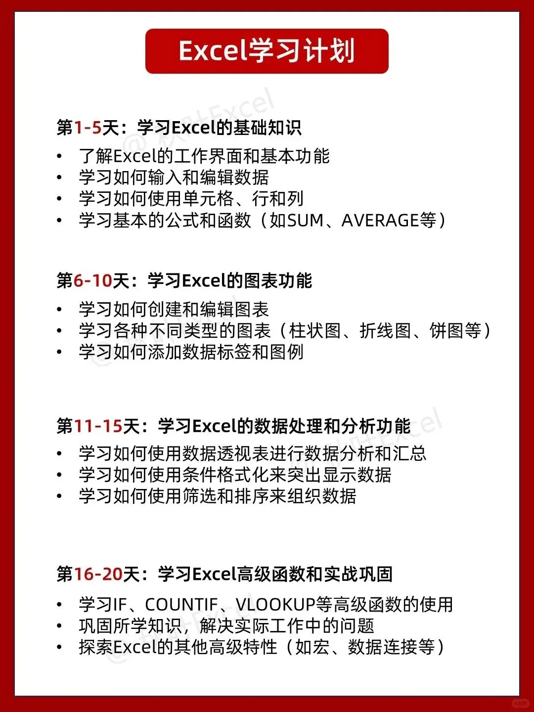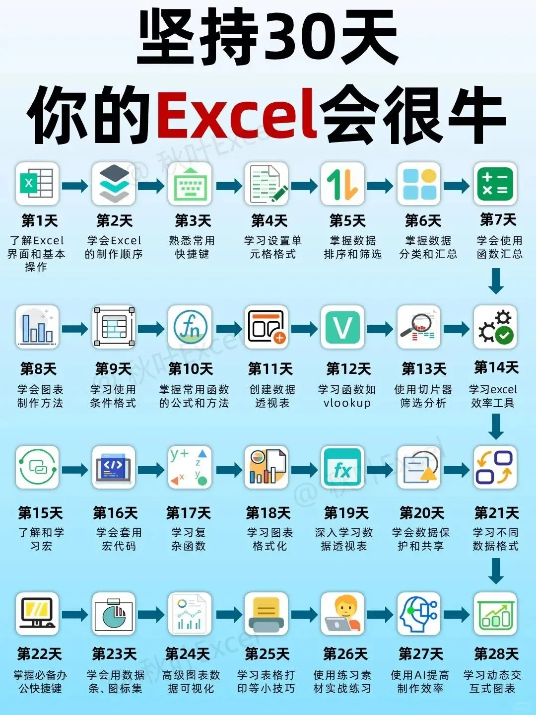 Excel学习没有捷径,但有正确的顺序。从基础到进阶,从函数到图表,每一步都踩在点上,28天就能看到质的飞跃。别再盲目啃书了,跟着这份计划走,你也能成为办公室里的Excel高手。