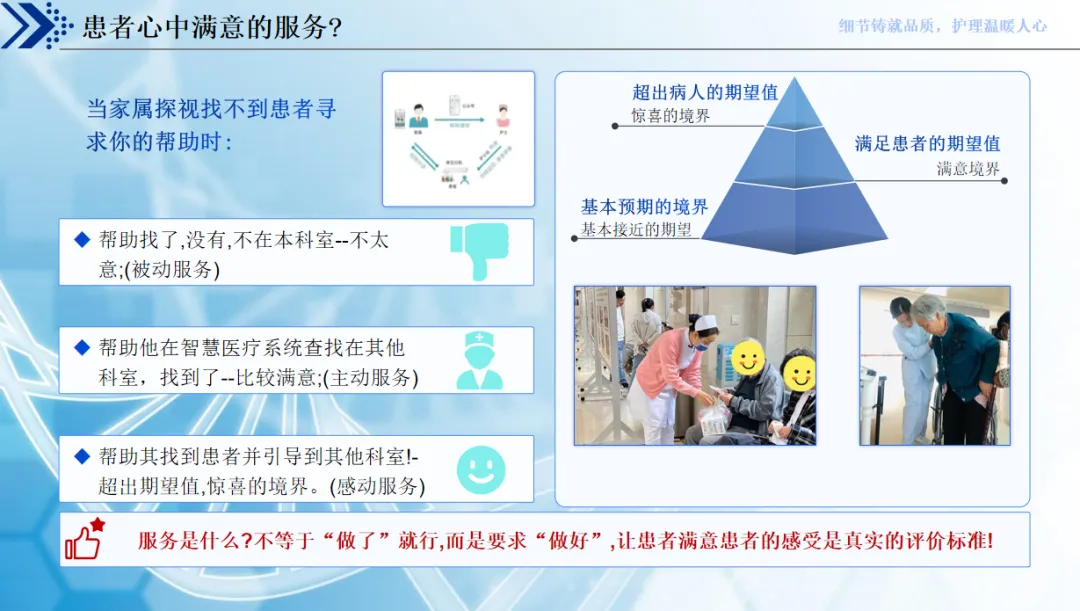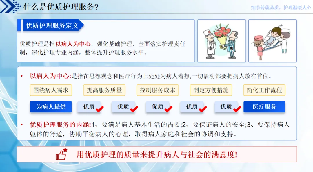 优质护理的核心,就是事事为病人着想,从满足基本生活需求、保障就医安全,到照顾身心舒适,再到联动家属和社会,全方面为患者考虑。患者心中的好服务,也从不是 “做了就行”,而是 “做好做细”,从被动回应到主动服务,再到超出期待的感动服务,才是真正的满意服务。