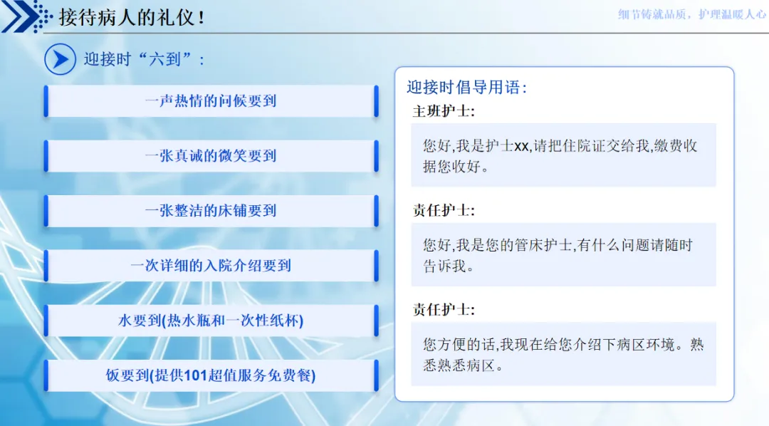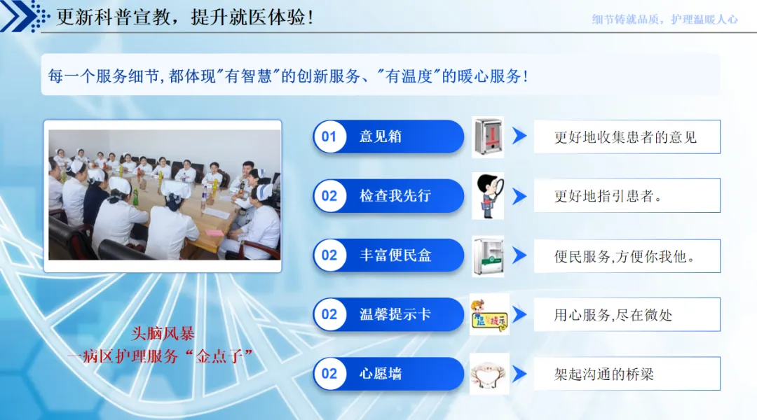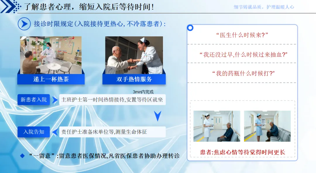 想要做好优质护理,细节体现在就医全流程。患者入院时,3 分钟内热情接待,递上热茶、做好介绍,落实迎声、答声、送声的三声服务,主动帮患者解决挂号、缴费等问题,打消入院的陌生与焦虑;住院期间,把基础护理做透,每日整理床单位、主动问候病情,落实床边工作制,同时深耕专业,通过培训、二维码宣教夯实技能,用微笑和亲切口吻沟通,操作前解释、操作中问候、操作后宣教,还为特殊患者打造专属病房,用生日祝福、便民盒、心愿墙这些小细节拉近距离。