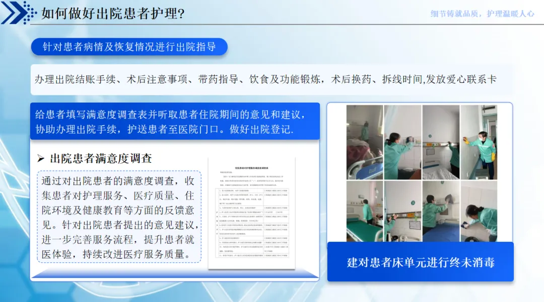 优质护理更要做好出院延伸,不仅要详细讲解出院后的用药、锻炼、复查事项,发放爱心联系卡,还要协助办理手续、护送患者出院,更要通过满意度调查收集意见,不断优化服务流程。