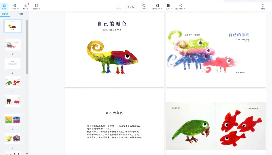 绘本阅读是幼儿教育的重要方式,但许多家长因孩子不识字或价格高而忽视其价值。实际上,绘本通过图文结合能同时刺激儿童的视觉和语言发展。优质绘本能提升儿童的认知、语言和社交能力。长期阅读对学业发展和亲子关系都有积极影响。绘本既是学习工具,也是亲子互动的桥梁。绘本PPT通过丰富多彩的故事和生动的画面,激发幼儿园儿童的学习兴趣,培养他们的阅读能力、想象力和创造力。 绘本PPT电子版画册涵盖了各种主题和风格,包括寓言故事、科普知识、生活常识、人际交往等方面,满足不同年龄段儿童的阅读需求。这些绘本不仅具有丰富的故事情节和精美的插图,还注重文字表达简洁易懂,适合幼儿园儿童阅读和理解。变色龙很苦恼,因为他没有自己的颜色,他总是走到哪儿,颜色就变成什么样。有一天,他遇见了另外一只变色龙,他们约定:既然改变不了现实的条件,就一起改变身上的颜色。从此以后,两只变色龙过上了快乐而满足的生活……