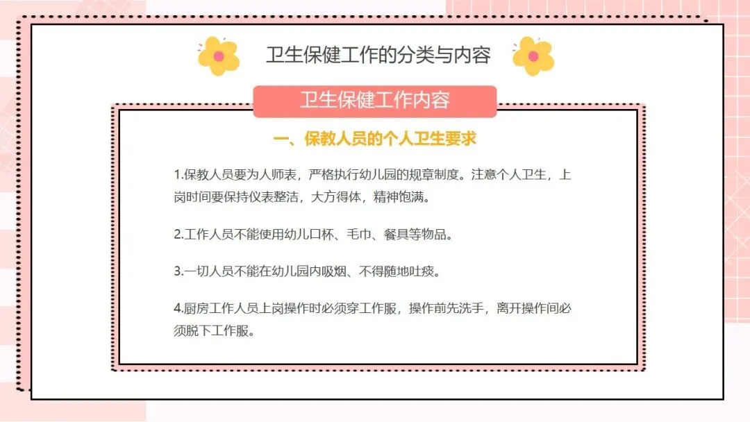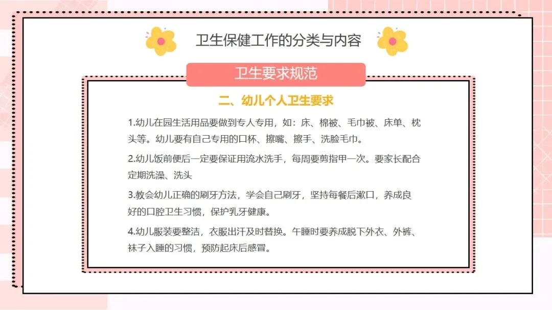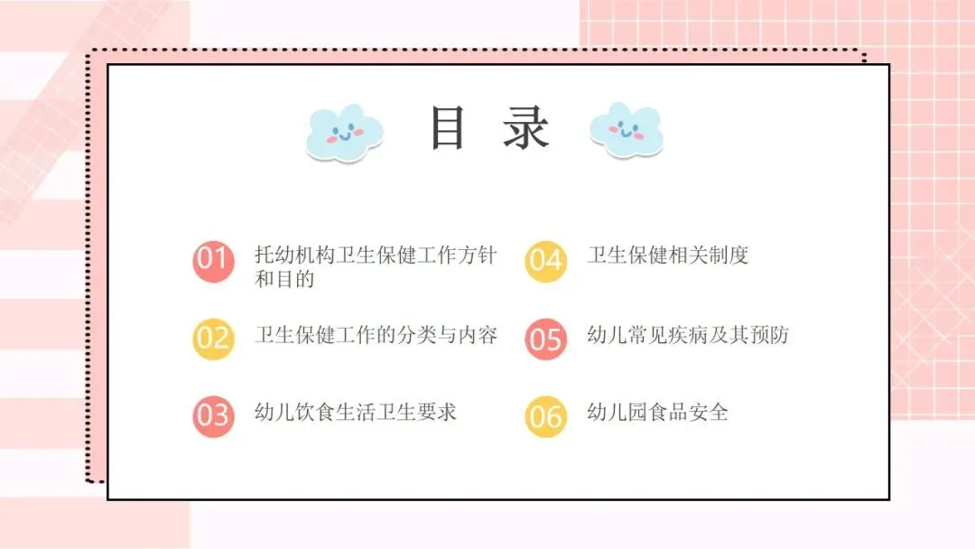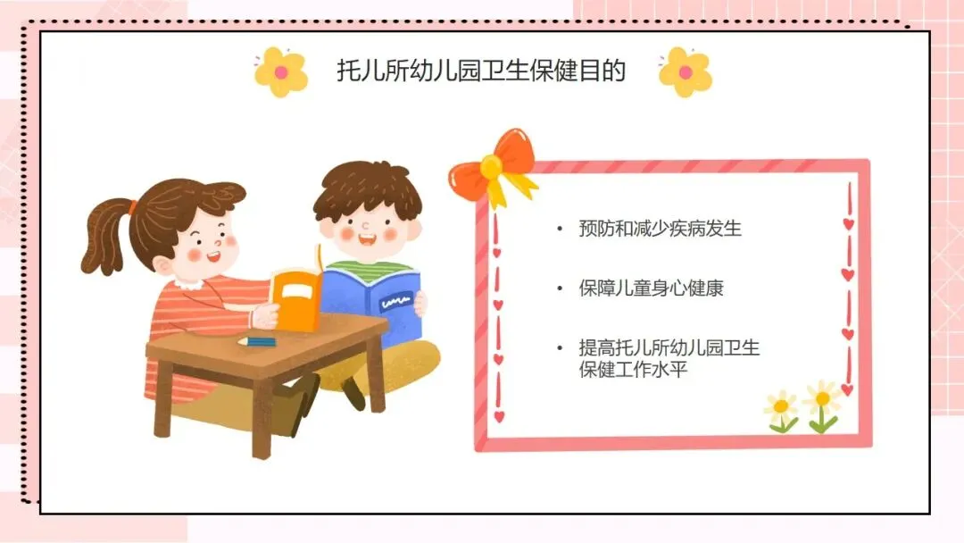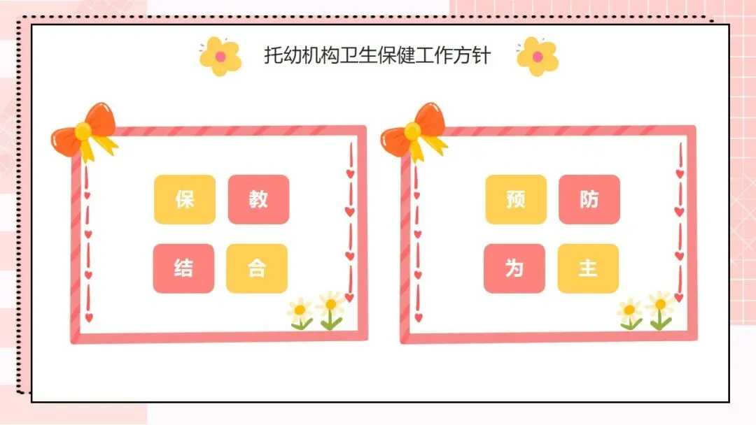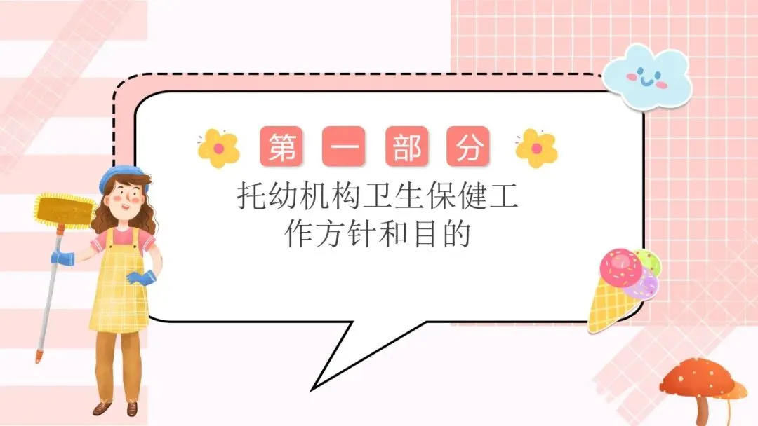 首先来看第一部分,托幼机构卫生保健工作的方针和目的。我们的工作方针非常明确,就是保教结合,预防为主。“保教结合” 要求我们将卫生保健与教育教学工作融合,在日常教学和生活中渗透保健理念;“预防为主” 则是卫生保健的核心原则,把疾病预防、安全防护等工作做在前面,才能从根本上减少问题的发生。围绕这一方针,我们的工作目的有三个:第一,预防和减少疾病在幼儿园内发生;第二,全方位保障儿童的身心健康成长;第三,持续提高我们幼儿园整体的卫生保健工作水平,让卫生保健工作制度化、规范化、科学化。