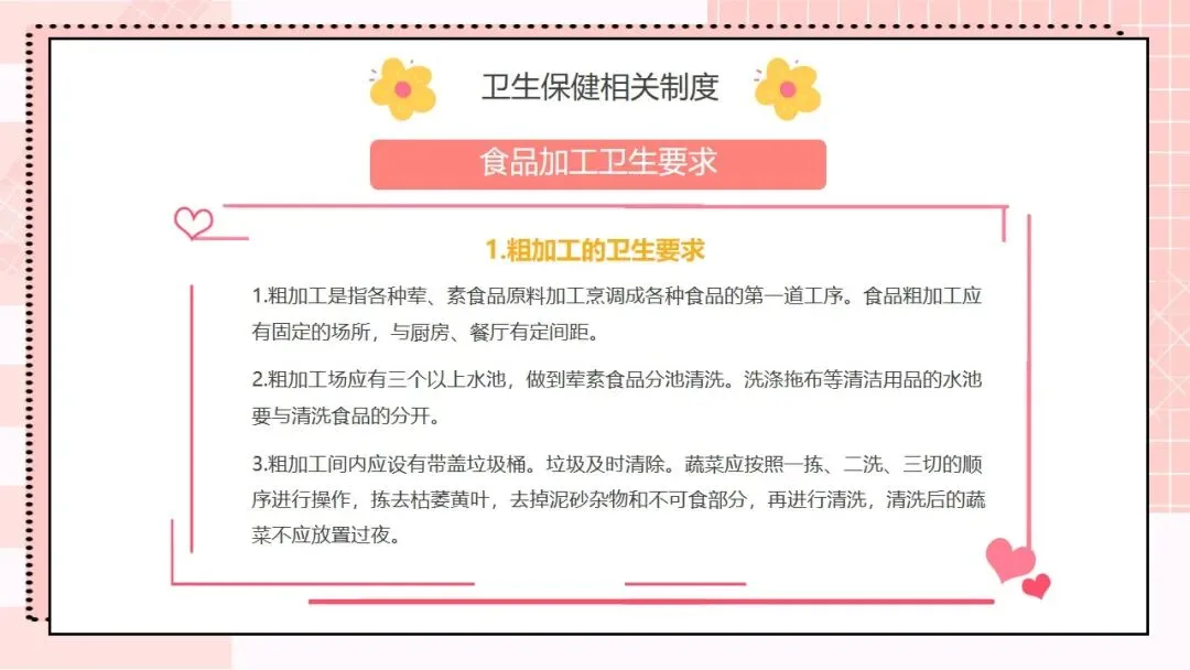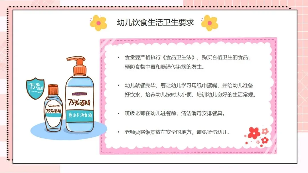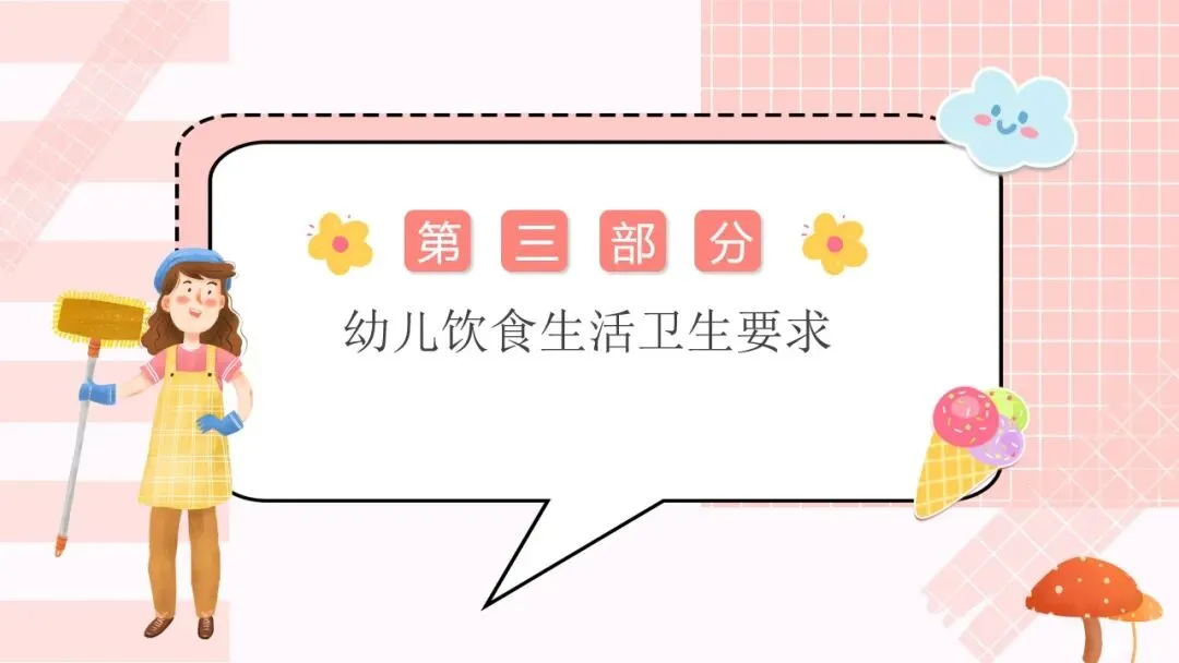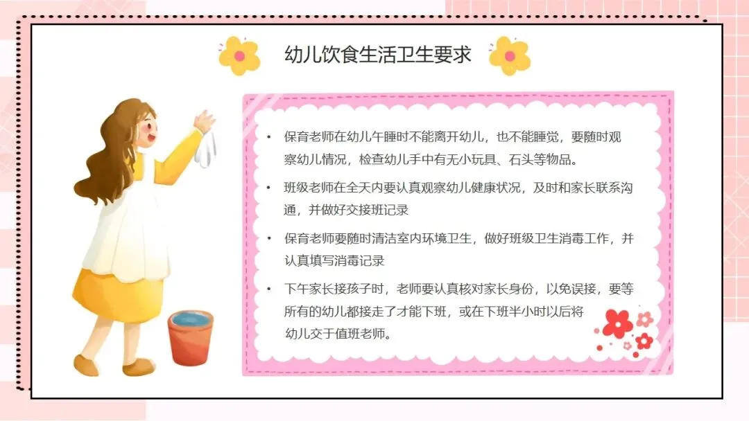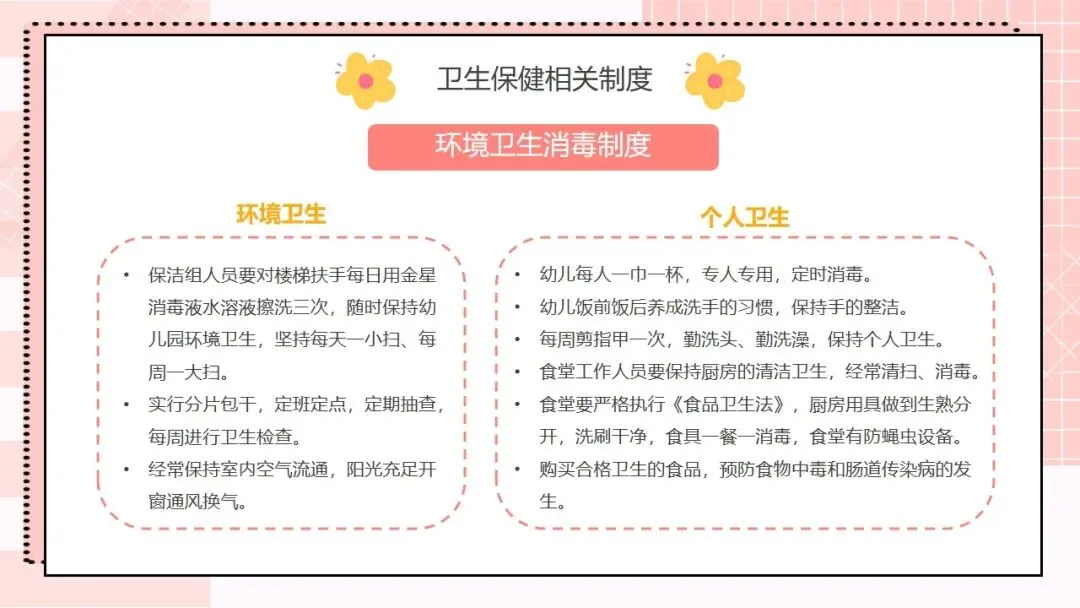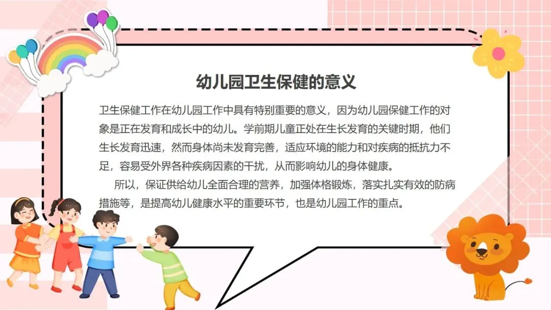 首先来看第一部分,托幼机构卫生保健工作的方针和目的。我们的工作方针非常明确,就是保教结合,预防为主。“保教结合” 要求我们将卫生保健与教育教学工作融合,在日常教学和生活中渗透保健理念;“预防为主” 则是卫生保健的核心原则,把疾病预防、安全防护等工作做在前面,才能从根本上减少问题的发生。围绕这一方针,我们的工作目的有三个:第一,预防和减少疾病在幼儿园内发生;第二,全方位保障儿童的身心健康成长;第三,持续提高我们幼儿园整体的卫生保健工作水平,让卫生保健工作制度化、规范化、科学化。